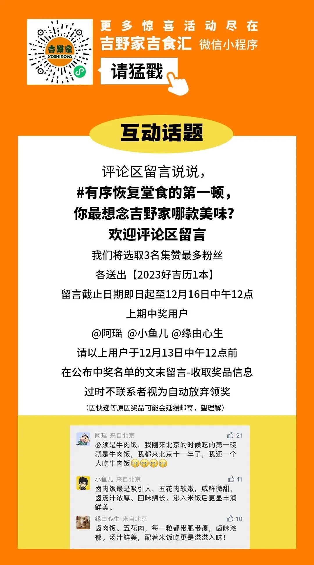 (4)仅限在「吉野家吉食汇」小程序-堂食/外带服务订餐时使用,若需外带需额外支付打包费用。有效期内每天10:00至21:00结业时间之前使用。每家餐厅营业时间有所不同,以门店实际为准。