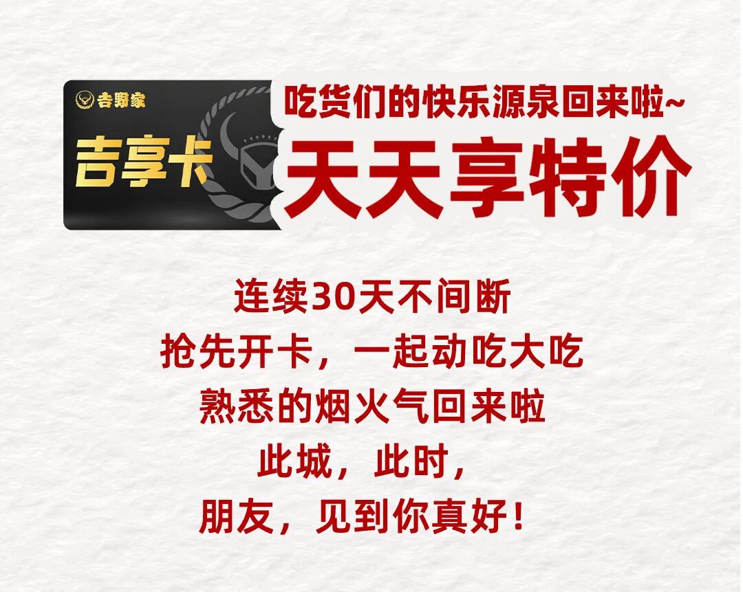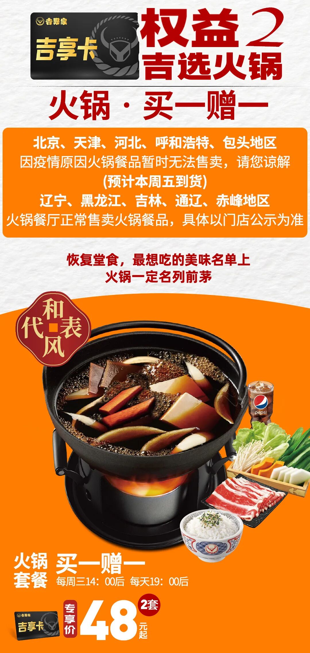 (1)吉野家吉享卡(会员权益卡)有效期内,在指定时段内可享受吉选火锅会员权益:单人火锅买一赠一(口味任选)每周三14:00后可用(河南地区每周三10:00后可用)、每天19:00后可用(黑吉辽、赤峰、通辽、河南地区活动18:00后可用)。
