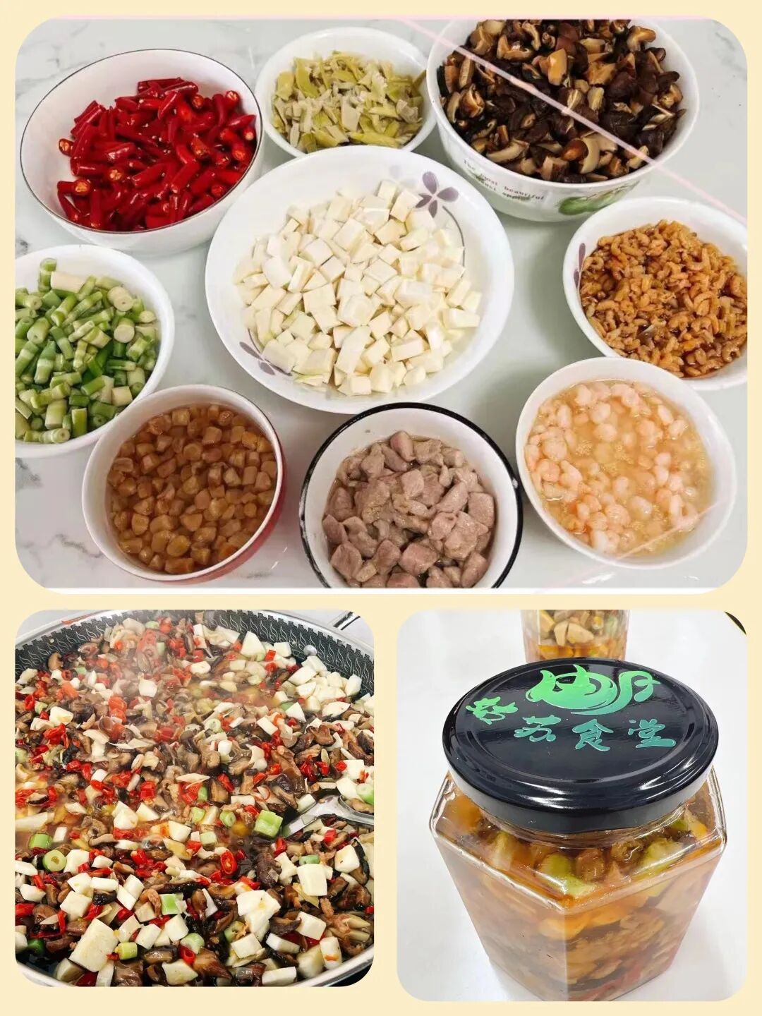 自制辣酱秘方:朝天椒、笋、茭白、香菇、开洋、虾仁、里脊肉丁、扁尖、干贝