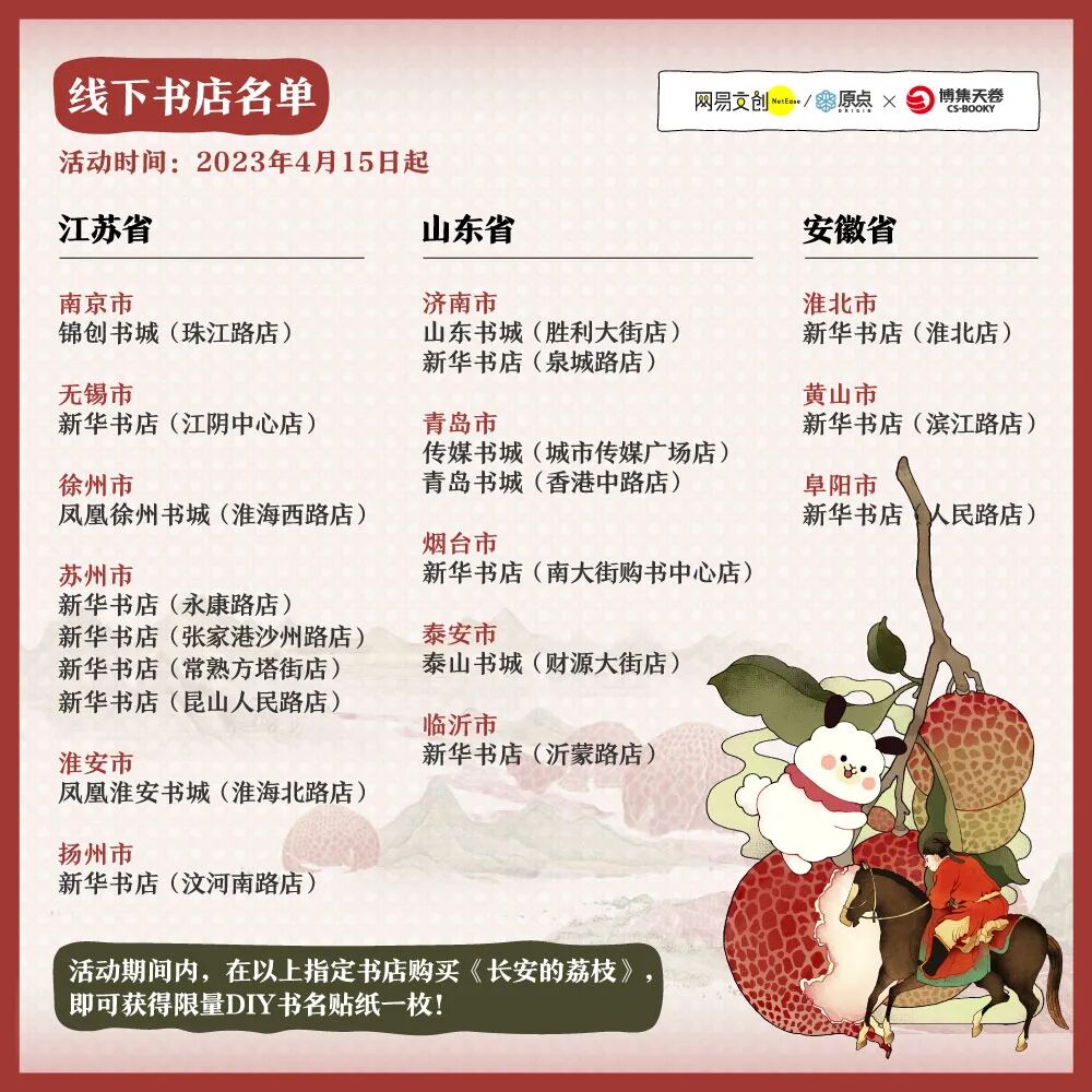 此外,我们联合@博集天卷 承办了《长安的荔枝》在江苏省、山东省和安徽省的线下主题展陈,欢迎前往以下 18 家书店打卡!