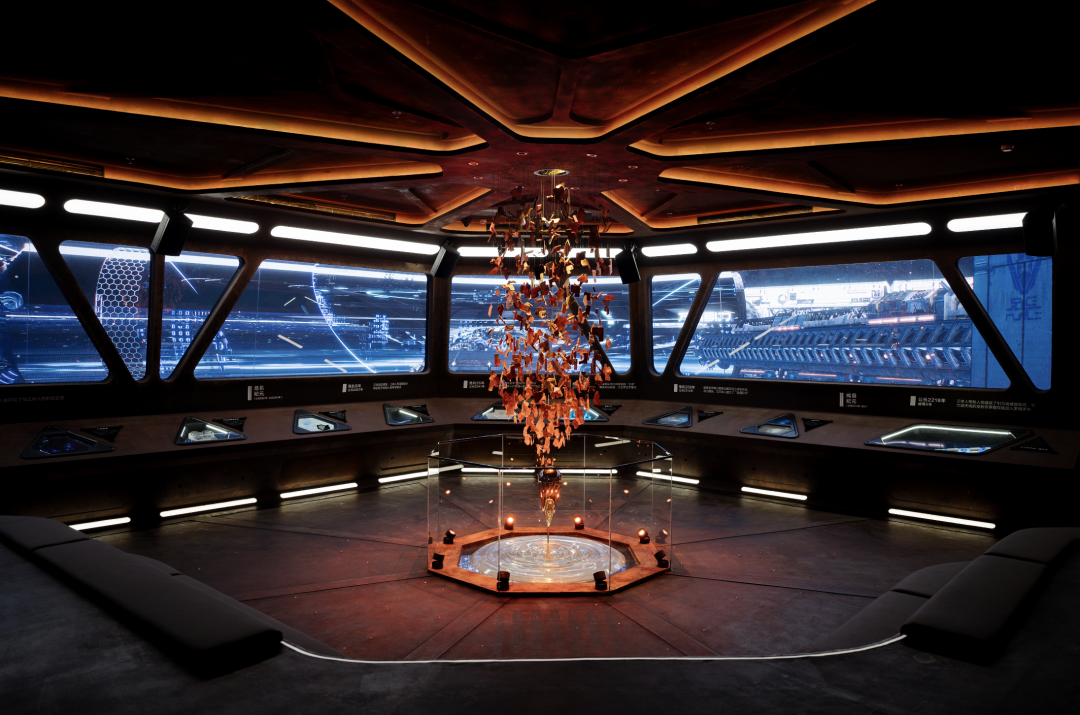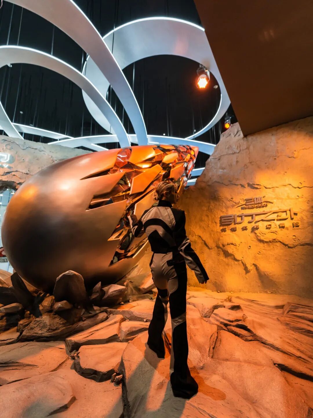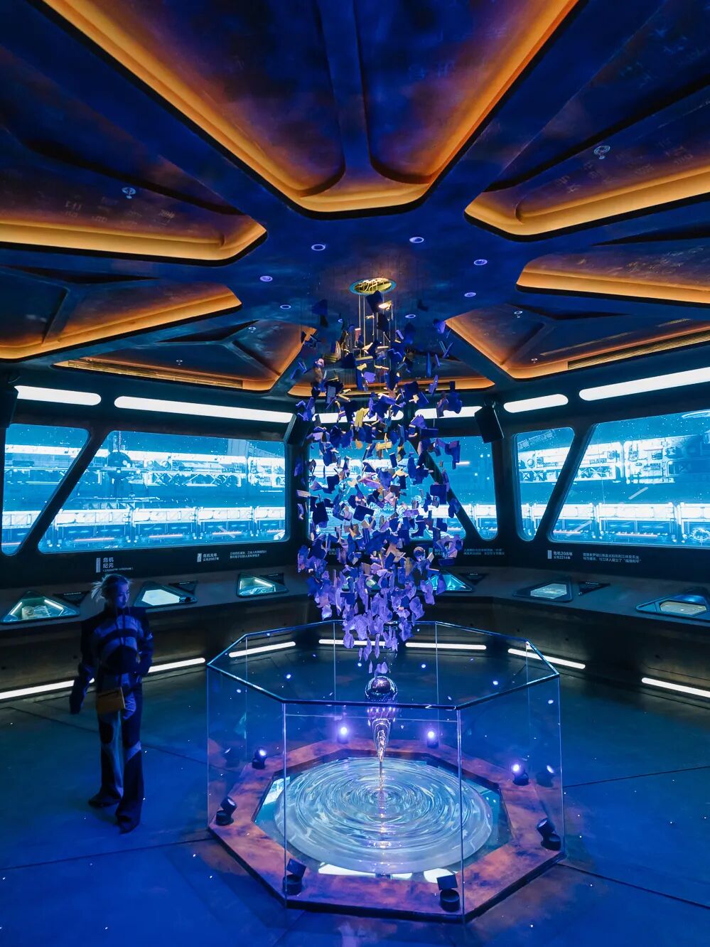 更为特别的是,占据入口处C位的巨型水滴装置,灵感来源于书中三体文明制造的宇宙探测器,不断变换的红蓝灯光更是吸睛度满分。