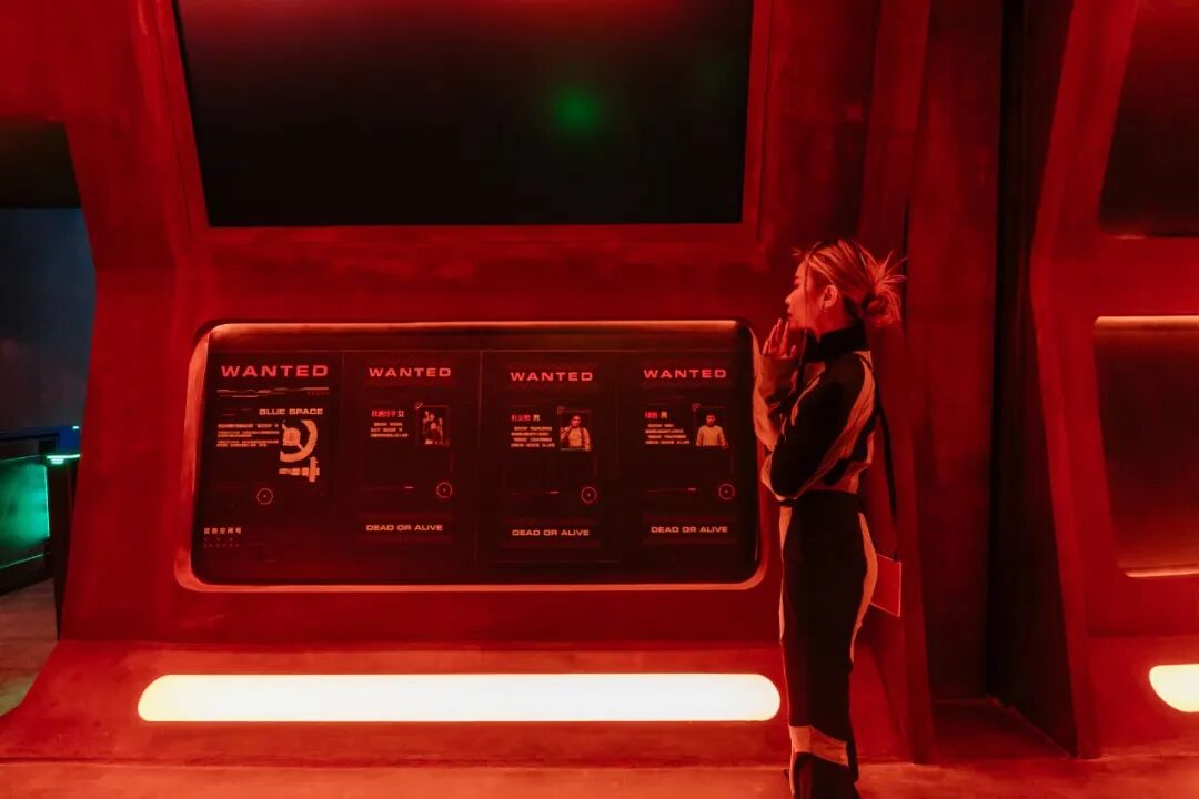 而作为一个改编自科幻作品的沉浸式体验,NFC手环创建理想角色、AirTouch肢体识别操控驾驶飞船、AR技术获取隐藏线索、VR头显执行出舱任务,在多种交互数字艺术的加持下,更是打破了虚实之间的边界。