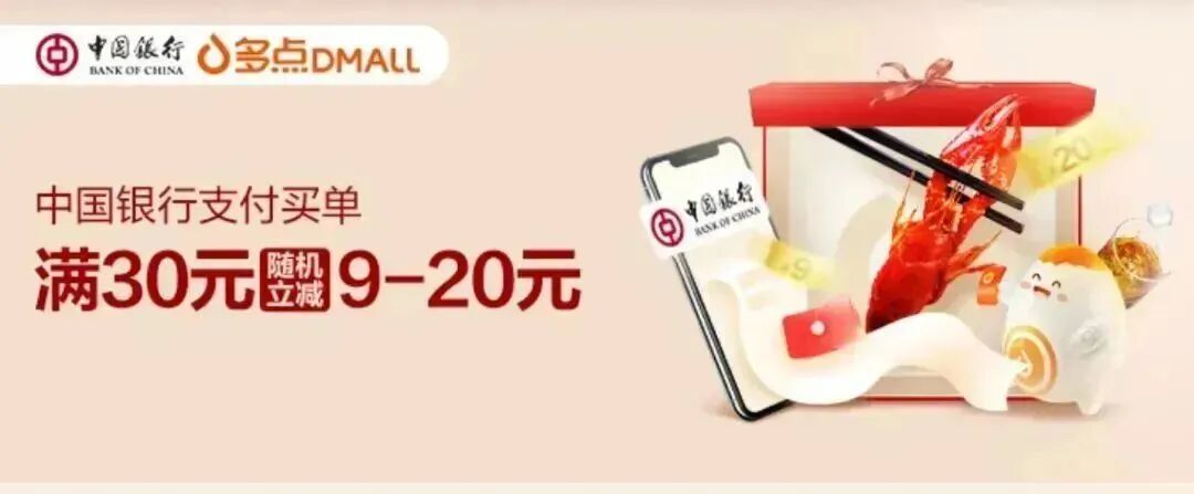 活动期间,客户在多点购物,通过多点APP使用中国银行支付(支持借记卡和信用卡),可享受单笔交易满30元随机立减9-20元优惠。