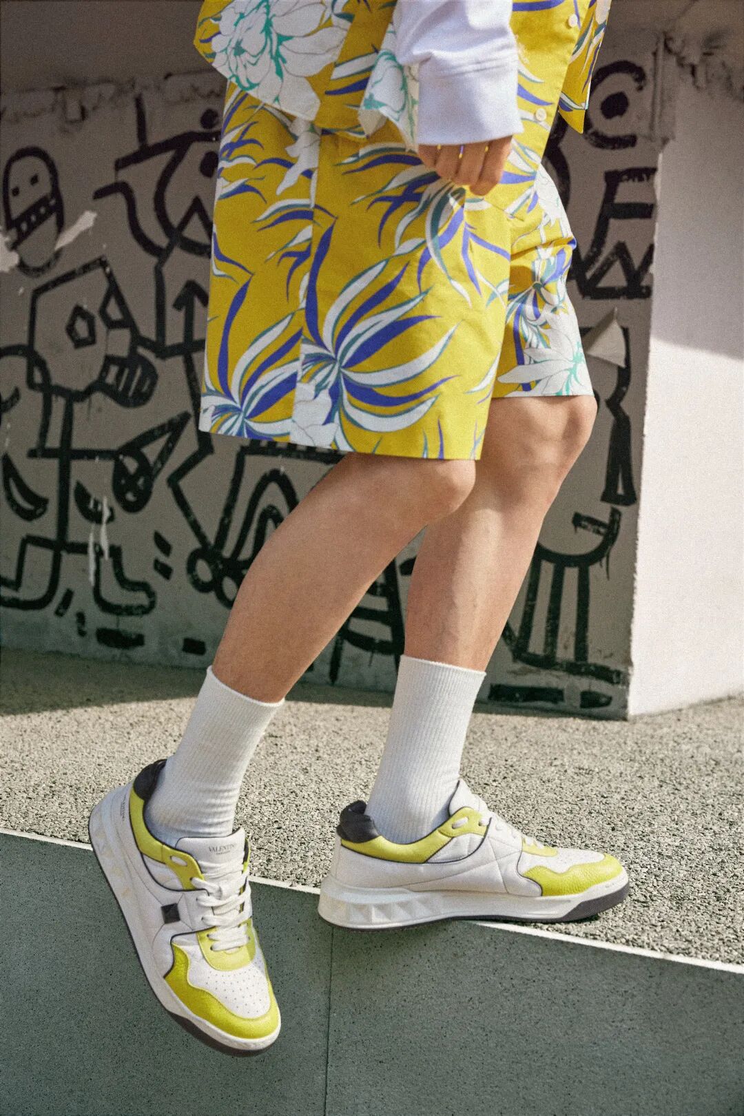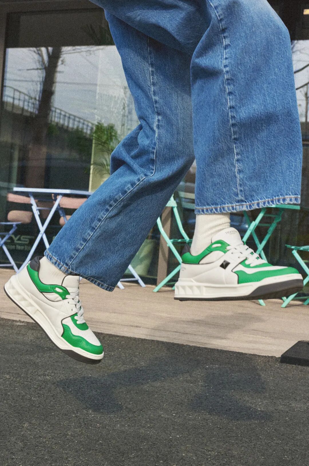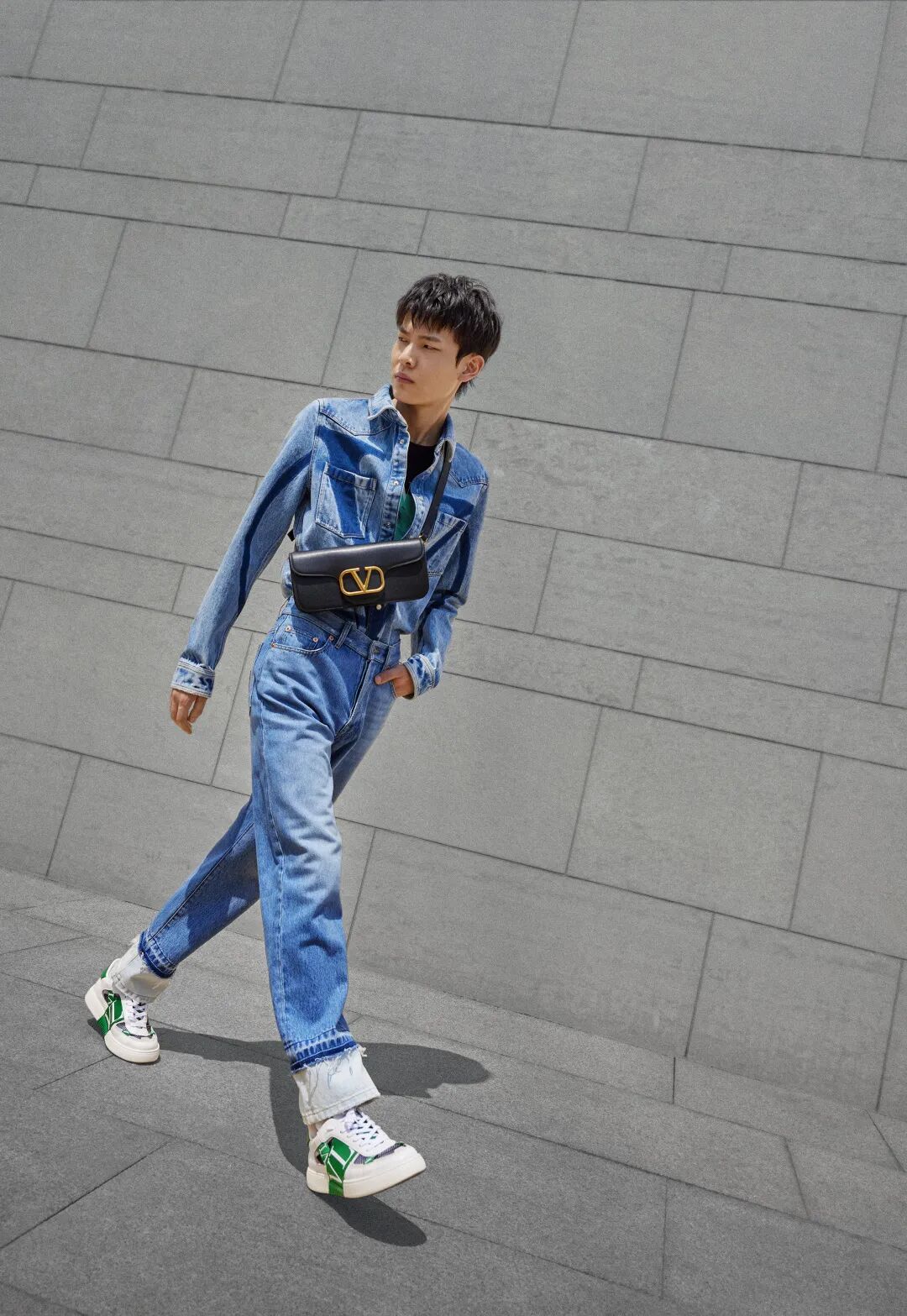 以白、绿色为主打色的 ONE STUD 运动鞋搭配,则应用了 VALENTINO 设计更具街头特点的印花连帽卫衣与直筒廓形的牛仔裤装,注重适应当季穿着习惯的同时,造型整体流露的休闲、随意感亦呈现出 VALENTINO 打破时装边界的多元可能性。