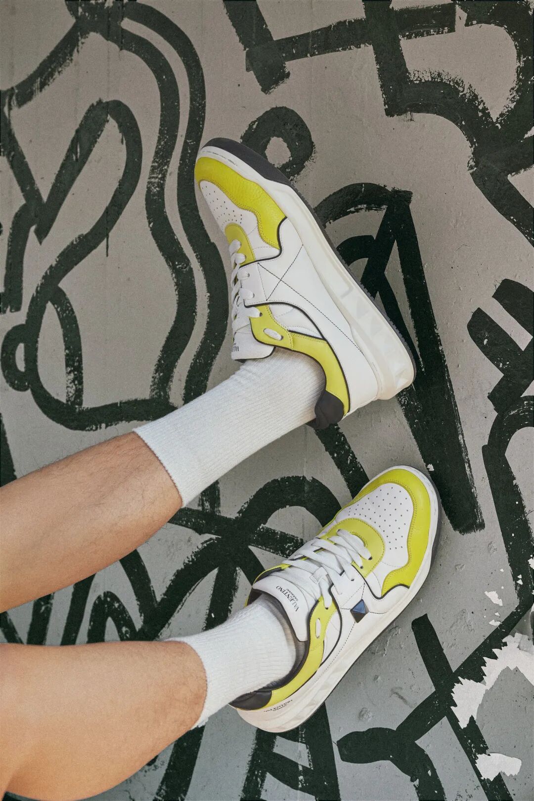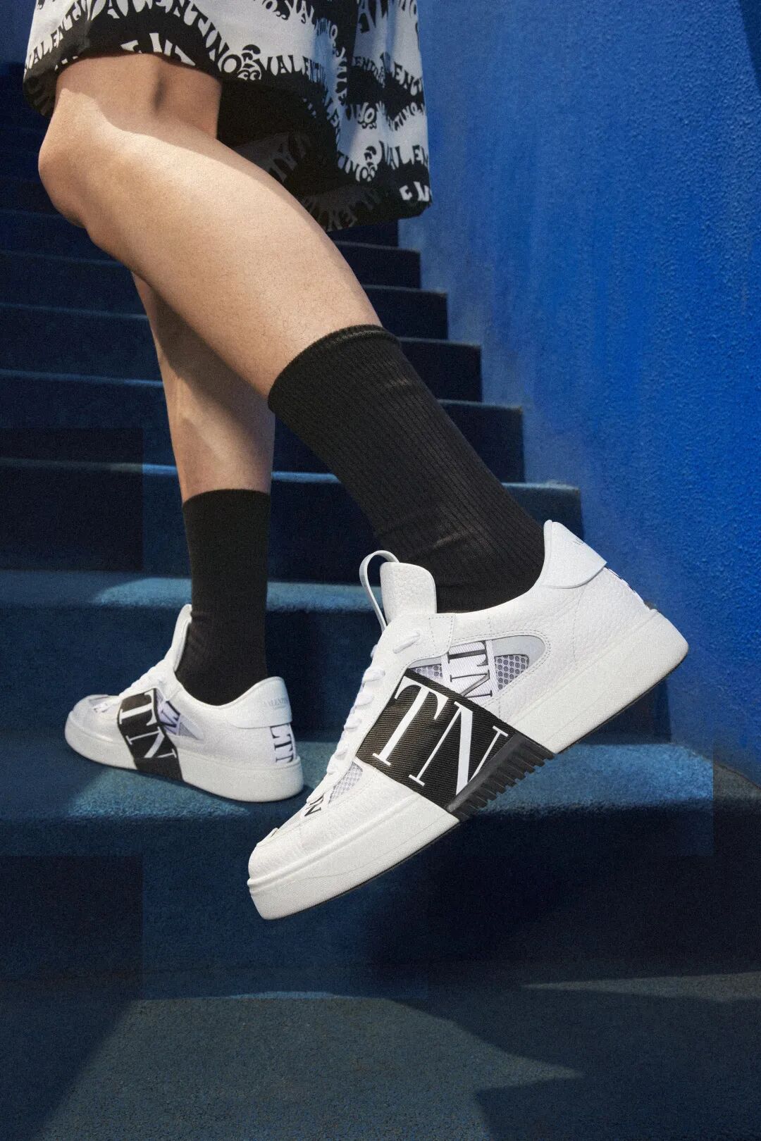 简约的运动鞋造型搭配横、纵向贯穿鞋身的7条绑带设计,大大强化了其中作为品牌符号的「VLTN」的视觉辨识度;附带透视效果的皮革网眼鞋面的灵感,则从当代流行文化与年轻人青睐的球鞋设计语言中取得。