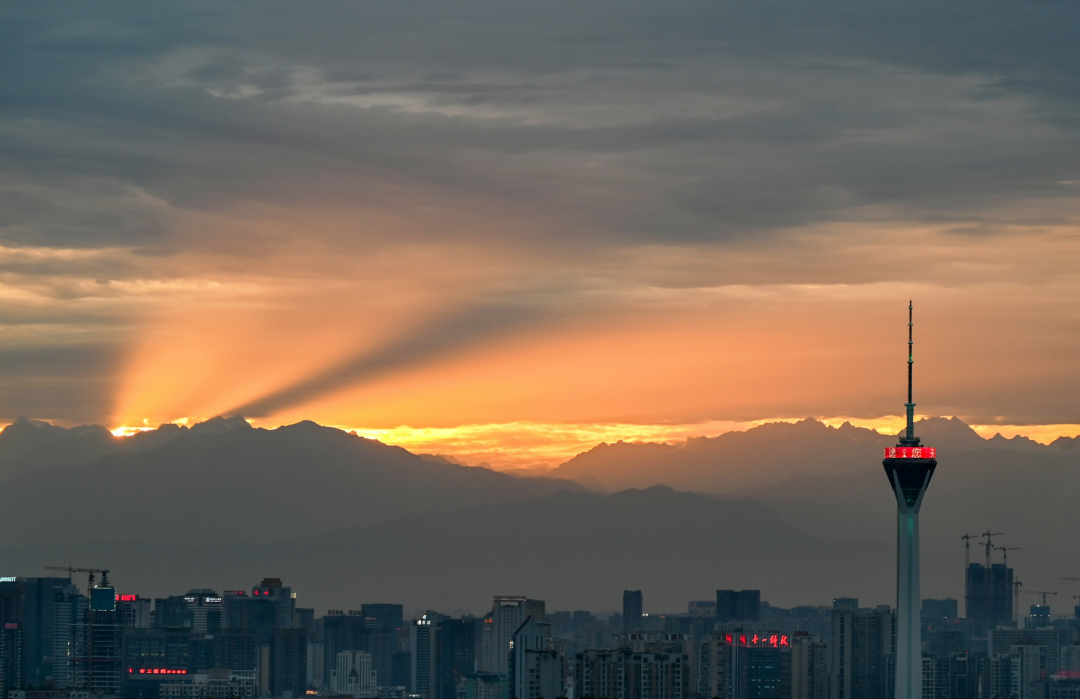 ▲夕阳下,339天府熊猫塔与雪山同框。
