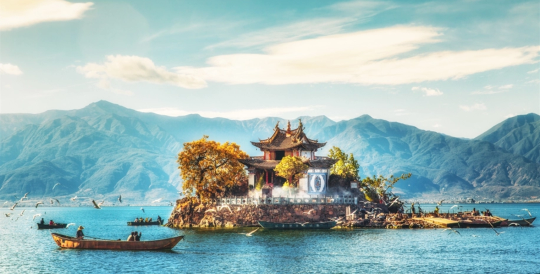 清晨、傍晚,苍山绵延,穿透云层的阳光在碧波荡漾的洱海上洒下金光,熠熠生辉。
