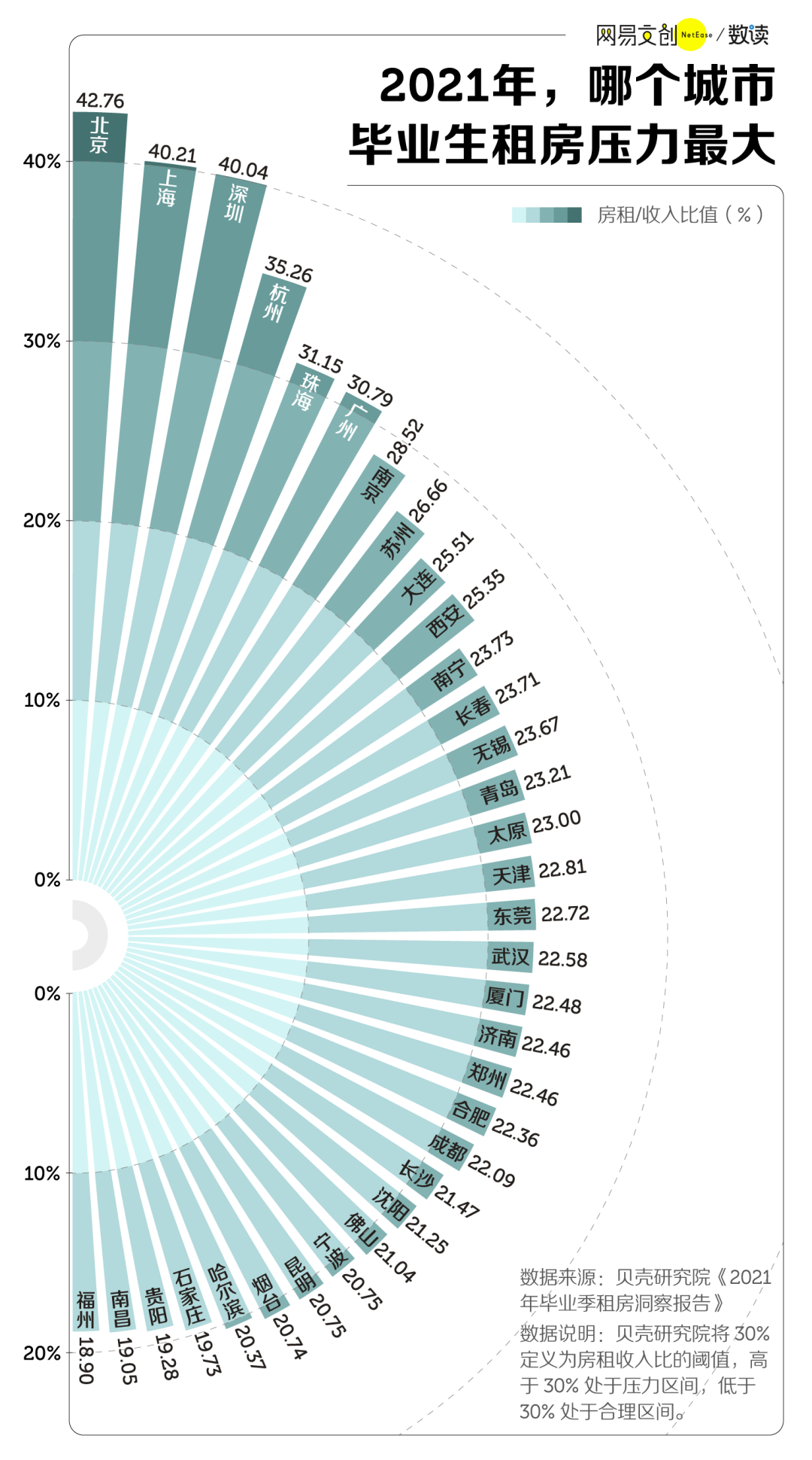 在北京、上海这样的一线城市,毕业生的房租收入比超过了 40%。而贝壳研究院指出,30% 是房租收入比的“幸福分割线”,超过就表示房租压力过大。