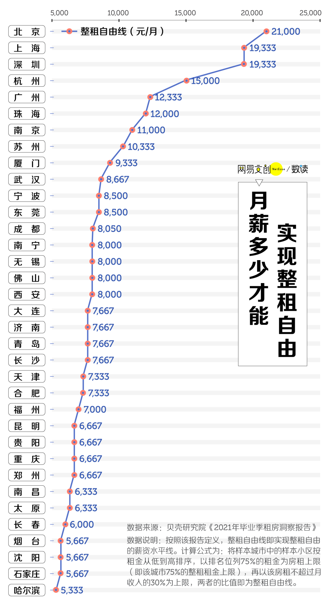 BOSS 直聘研究院的报告数据显示,2021 应届生春季招聘的平均薪资为 6112 元 [4]。但如果想要在北京实现整租自由,月薪至少要达到 21000 元;在新一线城市杭州,也要 15000 元。