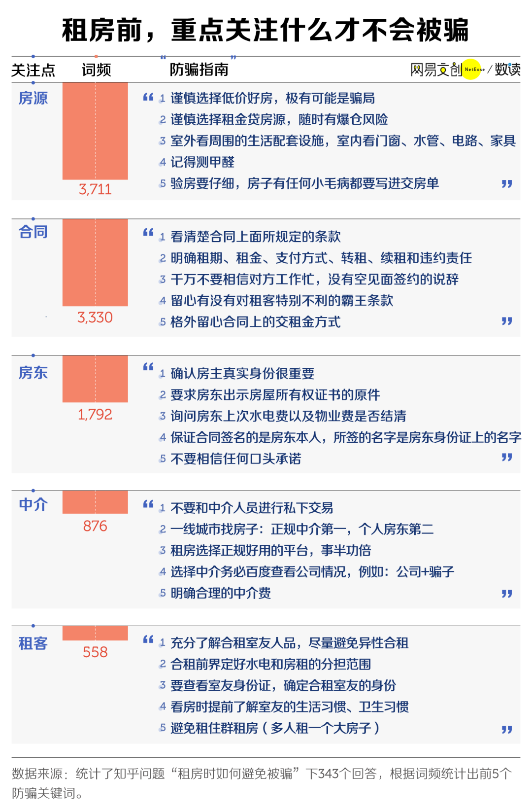 关于“租房时如何避免被骗”,通过统计知乎相关问题下的 343 个回答,可以总结得到五个高频关键词,依次是房源、合同、房东、中介和租客。其中,低价房源的问题最具代表性。