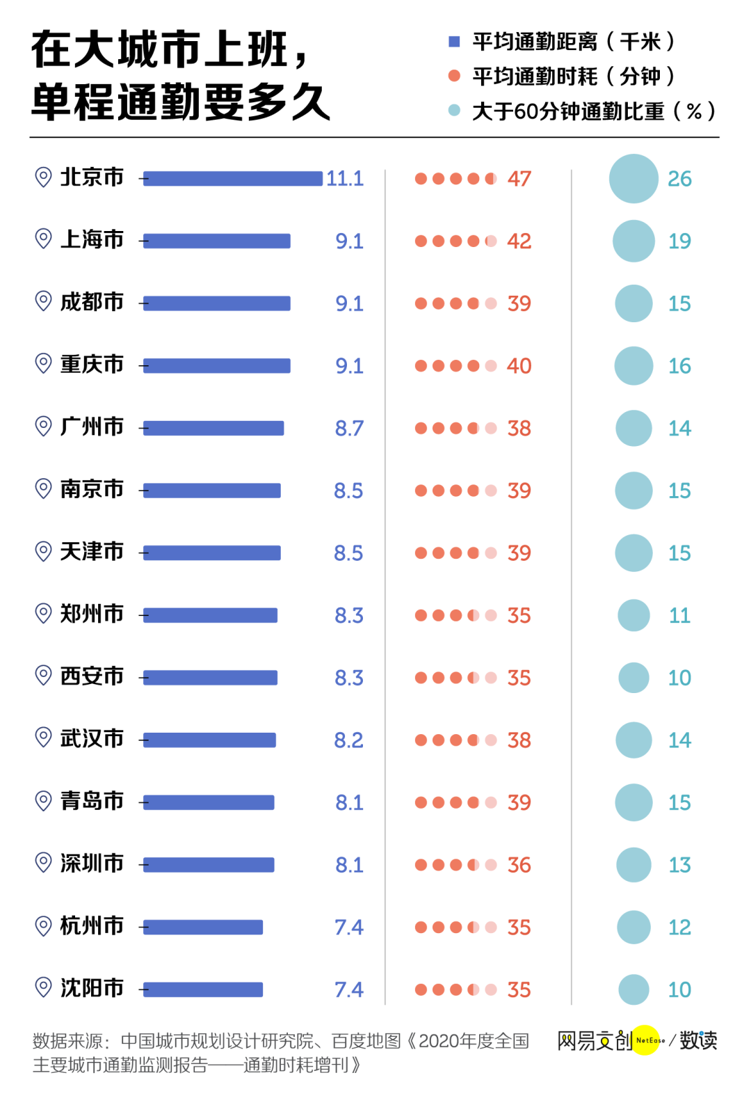 根据中国城市规划设计研究院、百度地图发布的《2020 年度全国主要城市通勤监测报告》数据,中国 36 个主要城市的通勤人口中,有 13% 的人,即超过 1000 万的人,单程通勤时间超过 60 分钟。