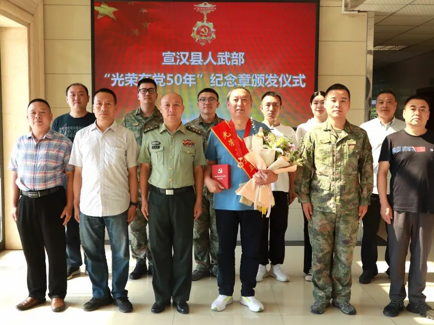一朝入党,一生为党。在“七一”来临之际,宣汉县人武部组织开展“光荣在党50年”纪念章颁发仪式,为老党员杨正发同志颁发“光荣在党50年”纪念章,并送上鲜花,让老党员感受在党50年的荣光,同时号召全体人员学习老党员对党忠诚、脚踏实地的精神品质,勉励新党员在强军新征程中踔厉奋发、勇毅前行。
