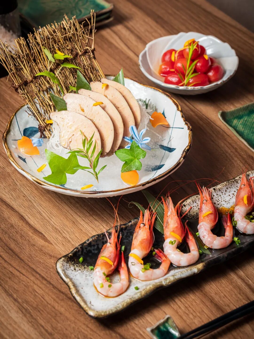 再搭配几碟清爽的日式小菜,玫瑰风酒渍甜虾、蓝莓鹅肝、白葡萄酒渍有机圣女果……堪称完美的夏日之夜!