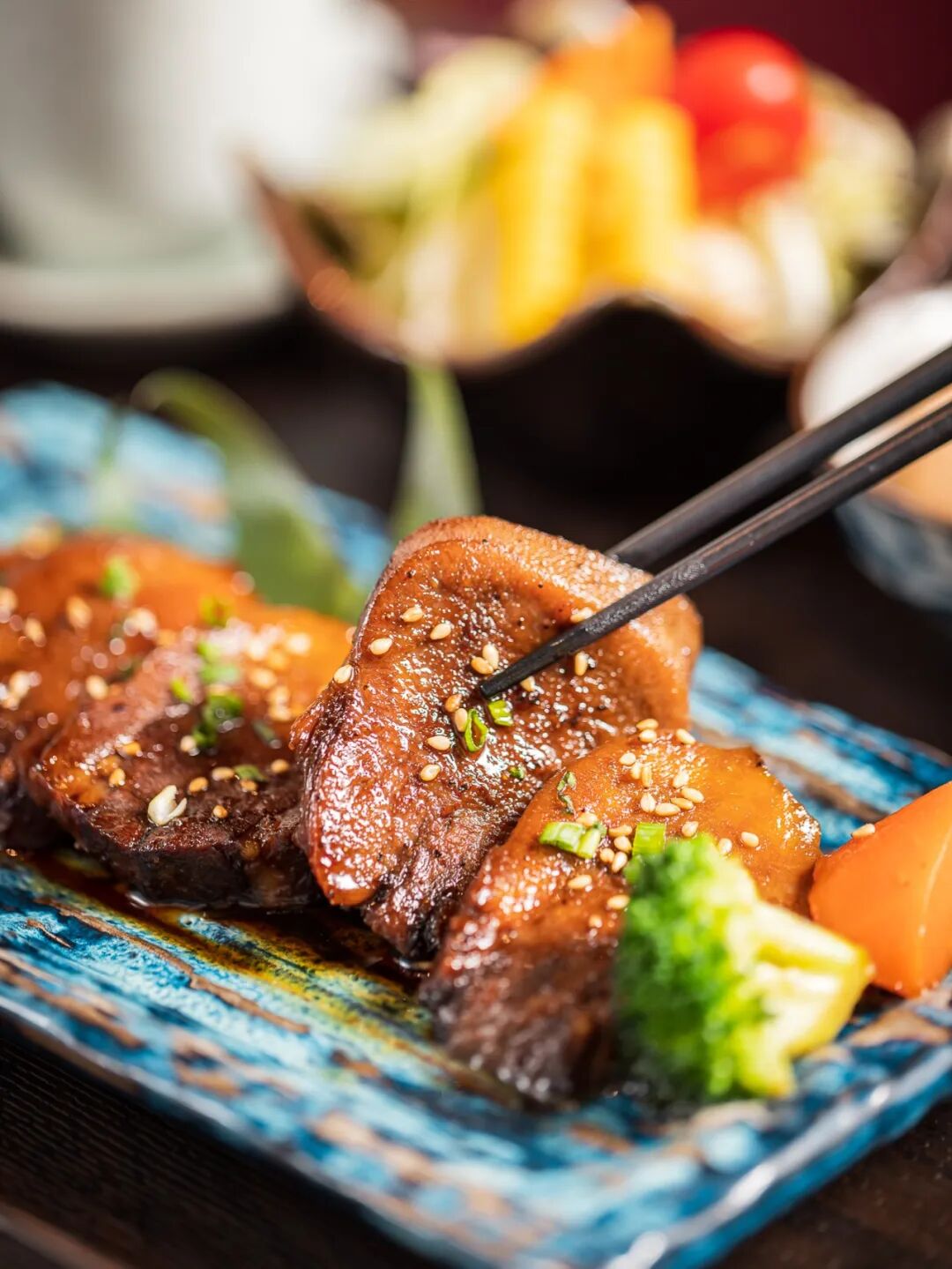 厚切的牛舌吃起来肉感十足,让人十分着迷,照烧酱汁的调味也是恰到好处。一旁搭配的日式蒸蛋、沙拉、水果、小菜、味增汤,清新又解腻,让人按捺不住大快朵颐的冲动。