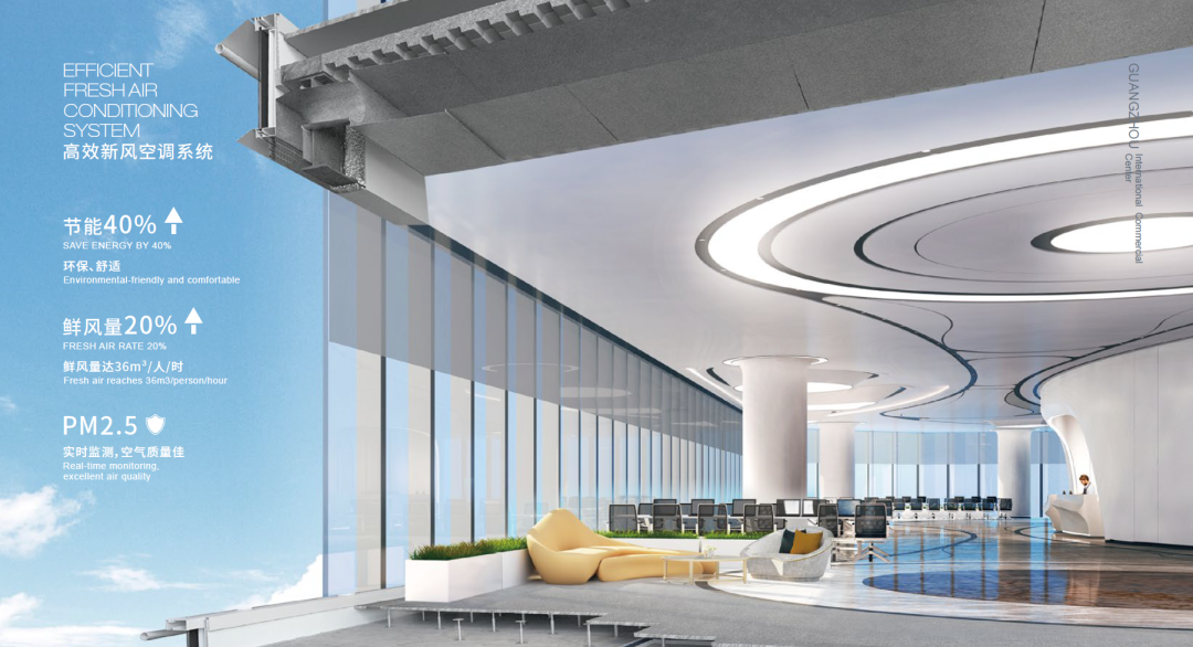 广州ICC关注客户的健康,倡导绿色建筑理念,荣获铂金级WELL中期认证、国家绿色建筑三星级认证;VAV空调系统、新风系统让环境指标更贴合人的体感舒适度;智能化技术对水环境进行实时监测及集成管理,保证饮用水的安全;LOW-E夹胶中空幕墙、LED防眩光照明灯光以及大量绿植,保护客户的身心健康......逾百项健康标准守护客户健康。