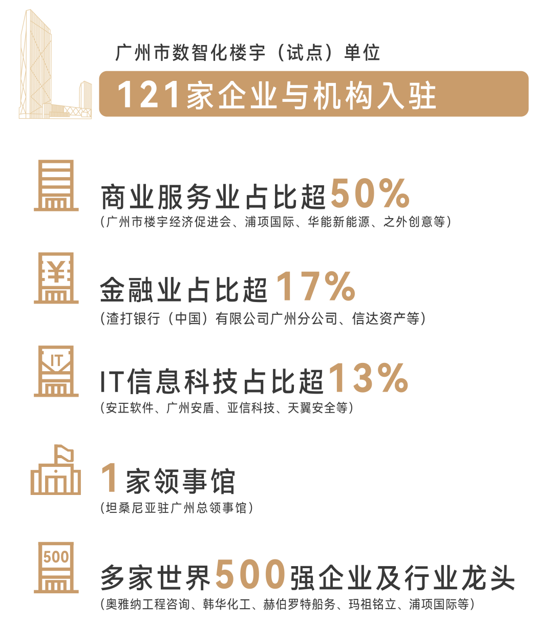 广州ICC作为大湾区数智楼宇新标杆,大力引入数字经济、科技金融、商业服务业等高端产业大鳄入驻,形成产业集群的发展态势,助推湾区经济。先后获颁“5G数字经济大厦”、 “广州市数智化楼宇(试点)单位"、“RICS中国奖2021年度商业地产项目冠军、最佳交易优秀奖”等荣誉称号,是粤港澳大湾区数字经济专业楼宇示范项目,引领大湾区数字智能楼宇加快发展。