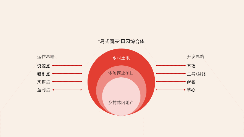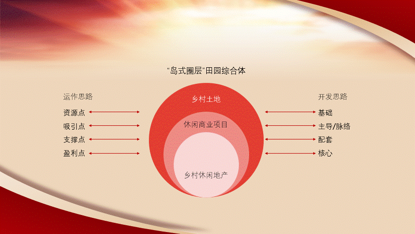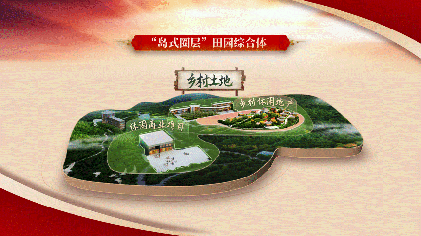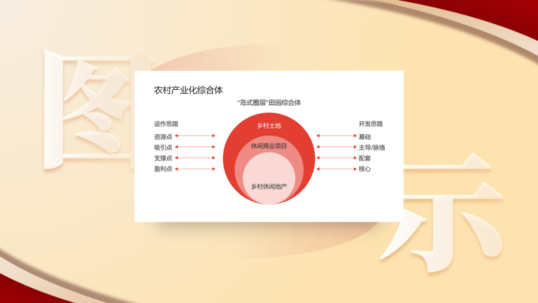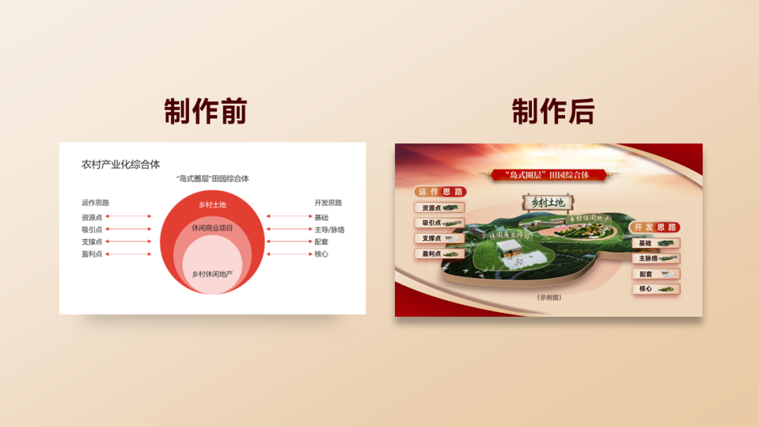 第七步:通过布尔运算做出页面形状修饰元素来辅助主体内容。第八步:最后将形状分上下对角叠加在画面中,聚焦又场景十足。接下来,是关于逻辑图示页面的信息展示,需要做的就是梳理原稿文字逻辑,将架构表进行图示化。第二步:根据圈层的图示内容进行可视化,从而放大图示内容,通过搜索,我们找到一张类似乡村旅游规划的效果图片,图里面几个建筑体,刚好能对应圈层的名称。第三步:那么尝试把图片先放进画面中,并通过色块来标记对应的圈层名称。发现个问题,由于图片整体平铺后的效果与风格的融合上,不是非常合适,反而显得非常脏,画面太满。那么我们就可考虑只保留局部的重点信息来进行强调和可视化。第四步:那么通过曲线功能勾勒出需要保留的部分后,与背景图进行合并形状:相交。第五步:为了让形状视觉效果更好,可将形状设置为三维立体效果。1.选中形状-设置图片格式-效果-三维格式(深度大小:21磅)