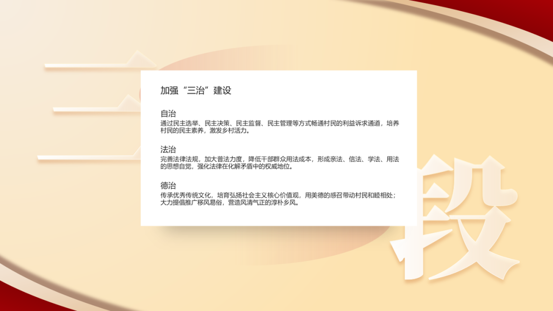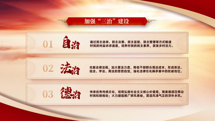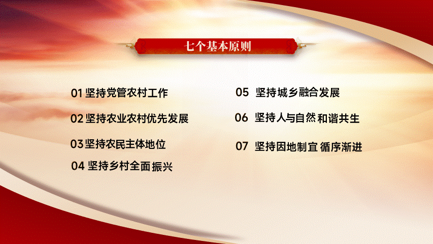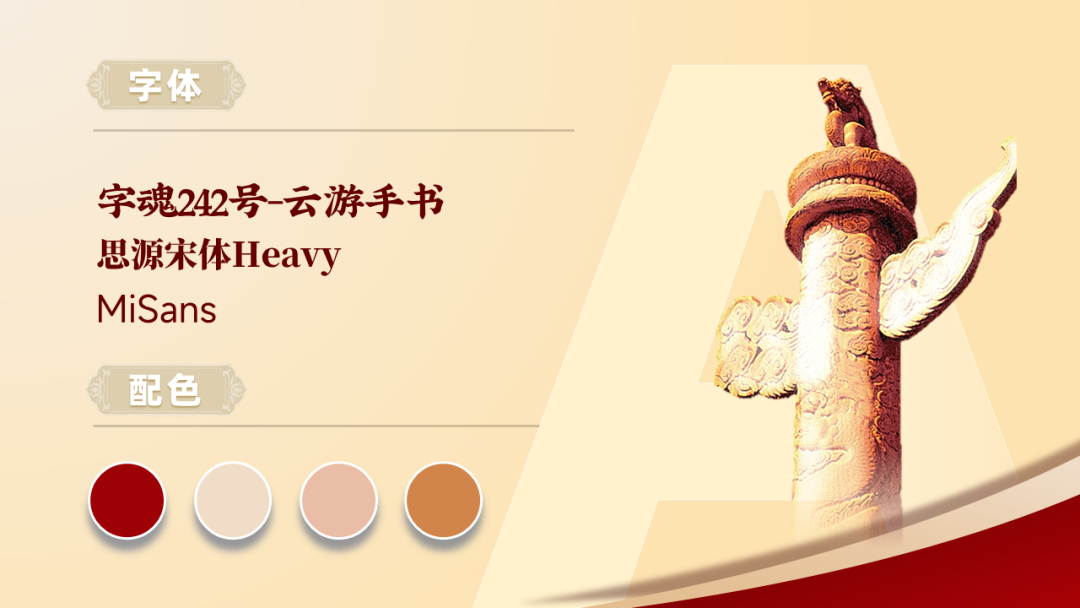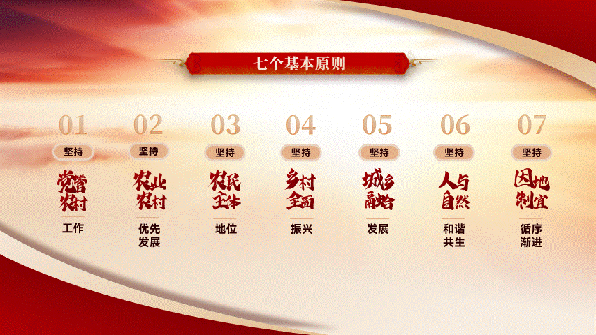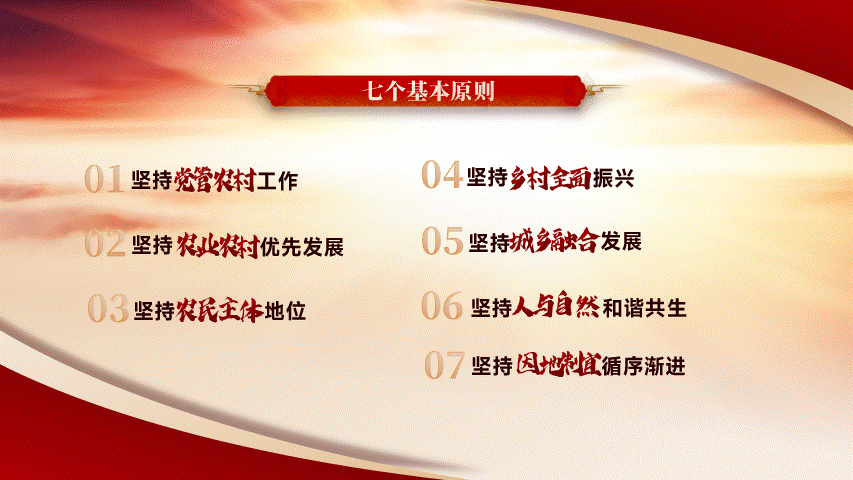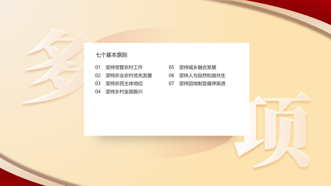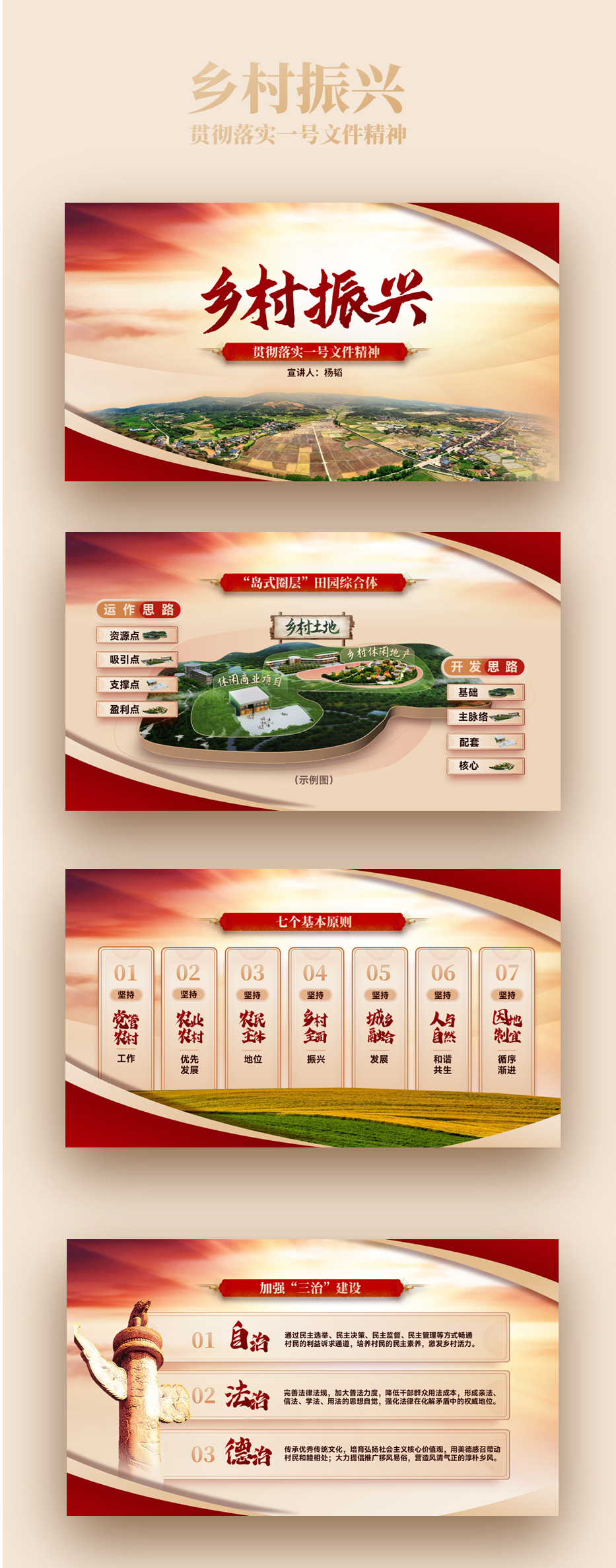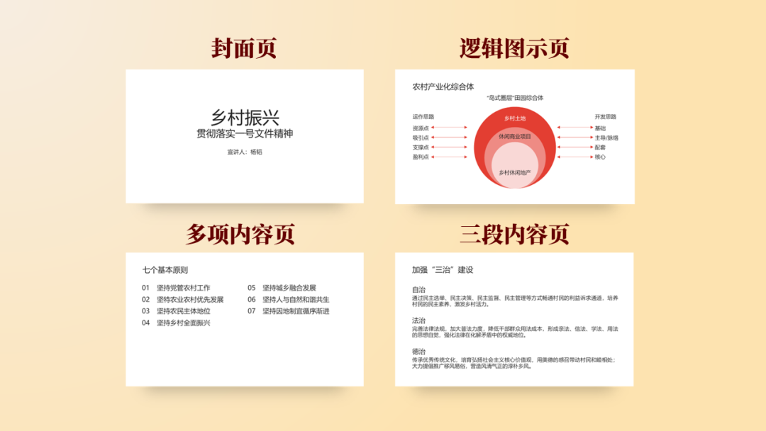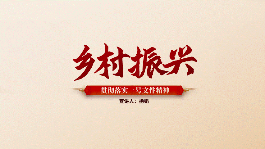 今天为大家分享的是一份党政风格的PPT,下面就把本次作品进行拆解和复盘,分享关于作品的设计思路。以下四页原稿,内容涵盖了封面、图示页、多项页、以及三段内容页的四种排版,也属于是一份典型的总结汇报型PPT。根据主题内容,我们得知是关于贯彻落实一号文件精神乡村振兴的宣讲PPT,是一份中央下发的重要文件。那么对于风格上的呈现,我们就可直接用党政类的配色,常规来说主打红黄配色,当然还有蓝色的配色方案,因为考虑本次主题的性质,所以就按常规来配色。因内容相对属于正式且严谨的,为了更直观的展现内容,选择了云游手书作为标题字体,思源宋体、MiSans作为内页文字介绍。