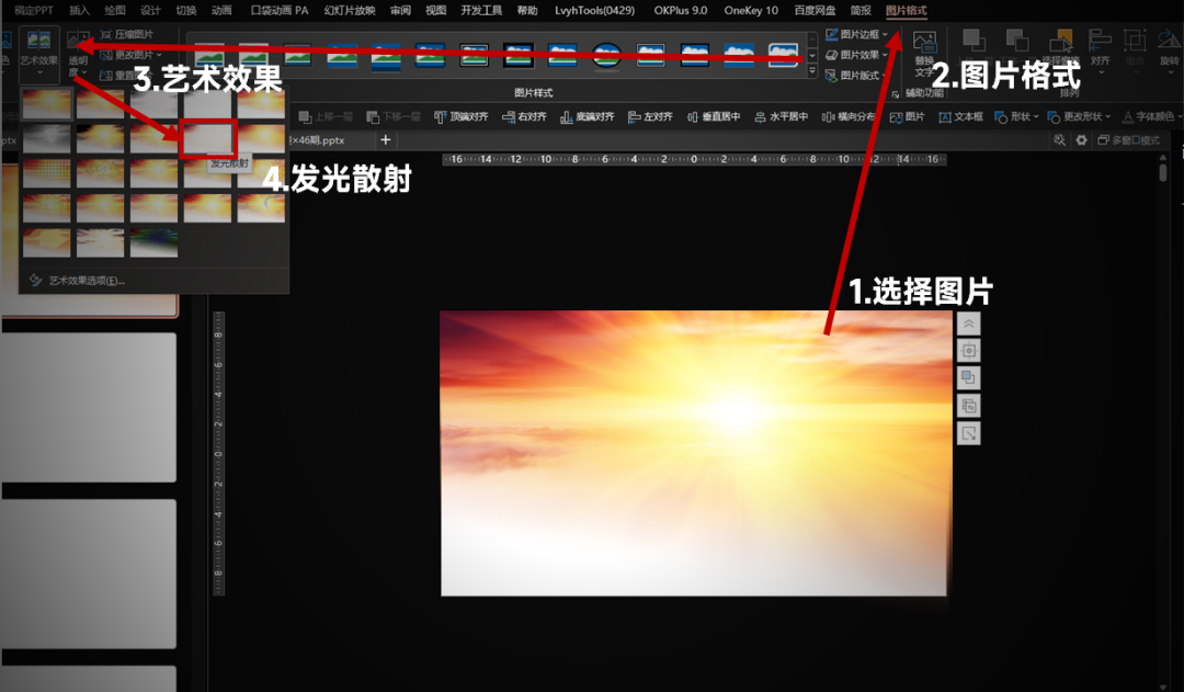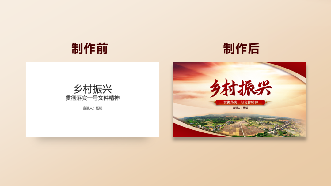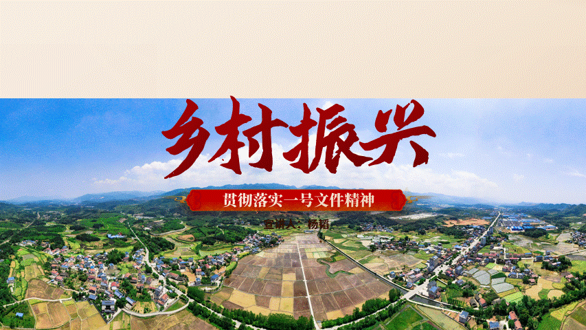 第二步:根据主题乡村振兴主题去发散,寻找相关的图片素材。第三步:将图片置于底层后,通过PPT自带抠图功能或片刻抠图(在线抠图)抠掉蓝天背景,并适当压缩图片,主题文字部分上移,形成图文对比。第四步:画面上半部分比较空,那么可以考虑加入阳光PNG素材(觅元素),与乡村图片进行融合,从而来呼应出振兴。第五步:因阳光素材亮度和饱和度太高了,导致与乡村图片的衔接对比上有很大问题,不柔和而且看上去很假。那么可以将图片通过PPT原生功能进行艺术效果设置:发光散射,在艺术效果参数中,将浓度调为:1。第六步:替换为处理好的阳光素材,同时将乡村图片进行弧化倾斜处理(OK插件-一键特效-弧化倾斜)弧化大小:40-50px。