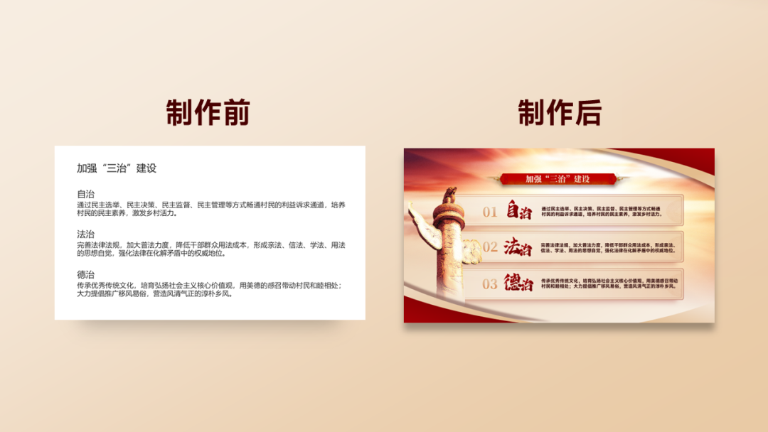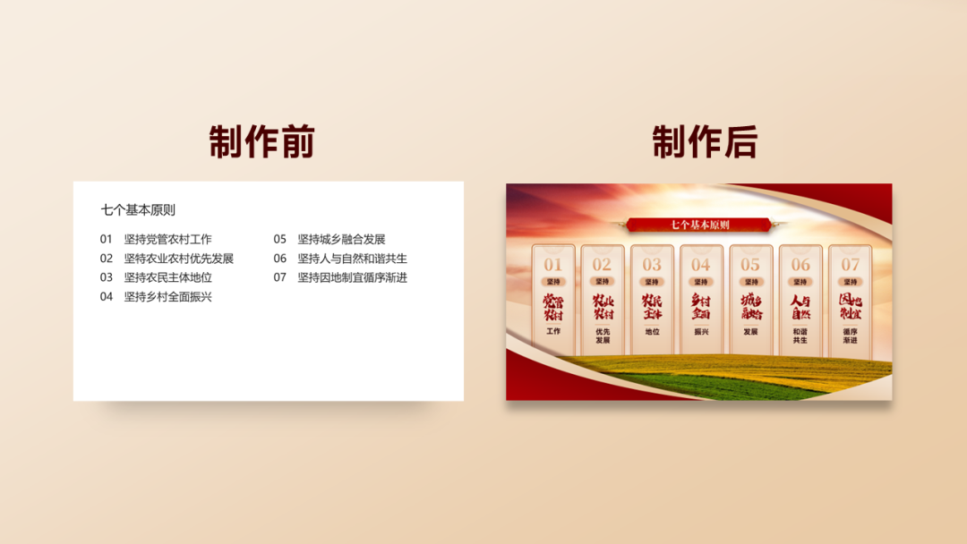第六步:将图片中的建筑单独抠图放置在原本的位置上,通过不同的色块来划分主体区域,三维效果立马出来啦。第七步:最后将运作和开发思路的2个信息块分别置于左右两侧,清晰明了。关于多项内容页的排版,通常面对这类页面,只要能突出各项信息点并规整排版就行。第二步:将横向排列改为竖向排列,整体视线更整齐和明了。第三步:最后叠加色块作为内容背景,下半部分插入田野图片来修饰内容。我们做内容页会经常遇到大段大段文字的内容,有些时候甚至要求不能删减文字,所以这时就需要去读懂去理解信息的含义后再进行提炼排版。第一步:将文字内容规范化,直接加入三个色块,简洁醒目。第一步:点击文章右下角的“在看”按钮
