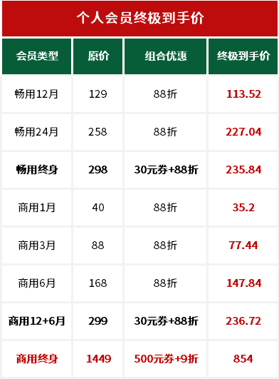 单人版畅用和商用会员全线降价,