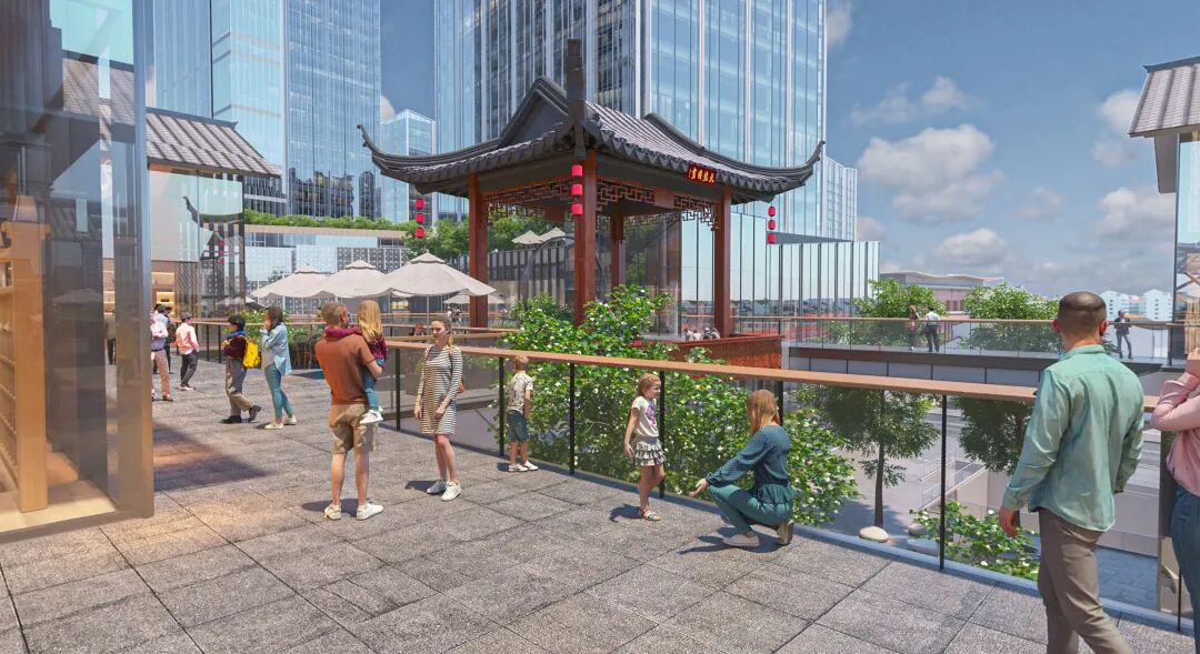 园林式商业街区与苏州古老悠久的历史气息相得益彰,再次呈现姑苏繁华烟火气。在商业街区购物之余,还能在飞莺台休憩观赏苏剧表演,在传统与现代之间穿梭,开启一场古今交织的新奇购物之旅。