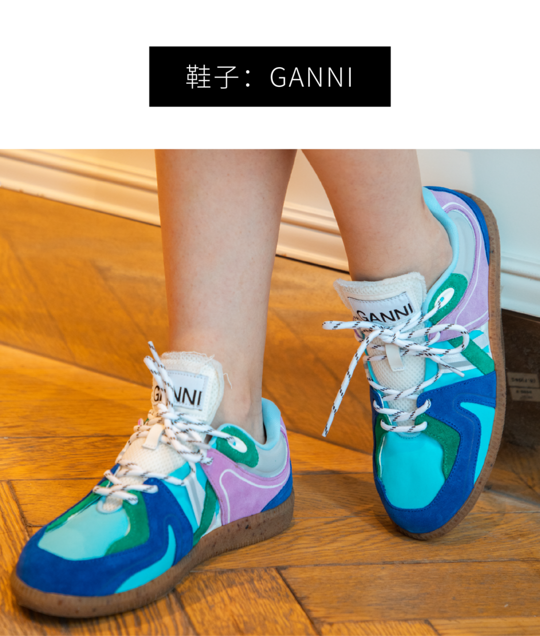 明媚活力的粉色搭配白色扑面而来的清爽感,脚下的GANNI鞋和整套look进行色彩的呼应,为夏日注入清凉多巴胺!