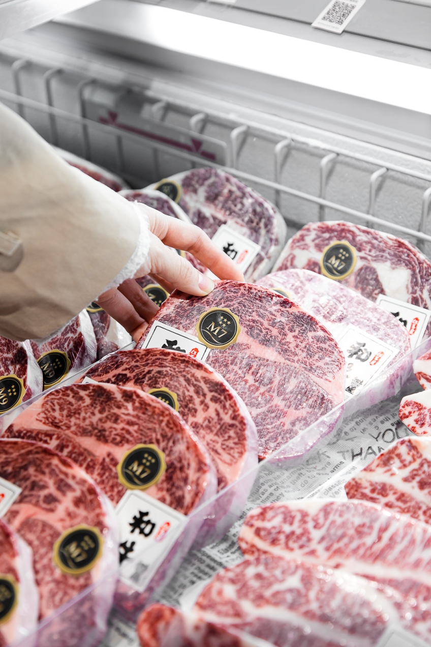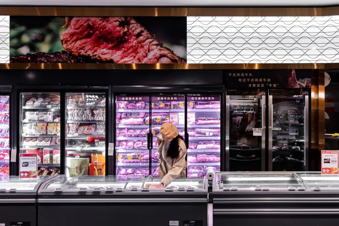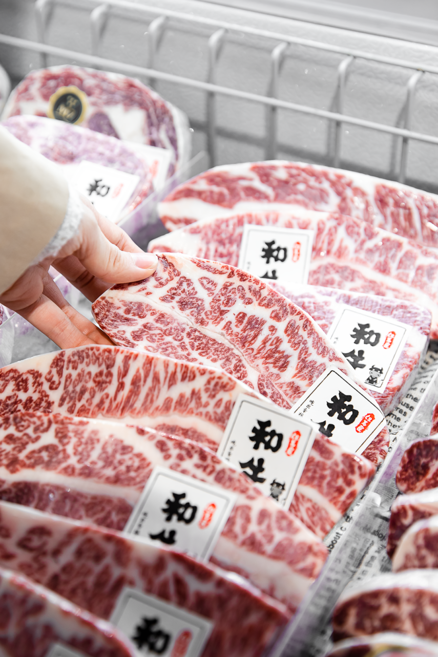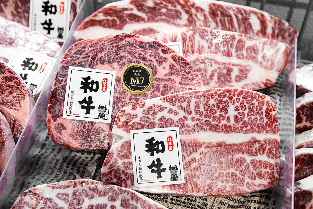 肉类陈列区里,光是和牛就占了四五个保鲜柜,其中澳洲和牛最值得买——选用澳洲新南威尔士北部高原牧场的日本和牛种,每头牛都以谷饲喂养500-600天以上。![]()