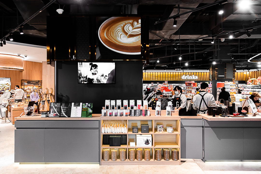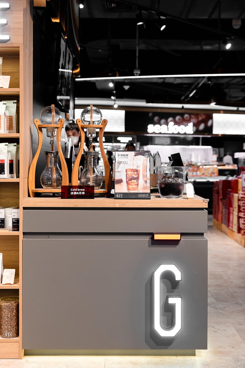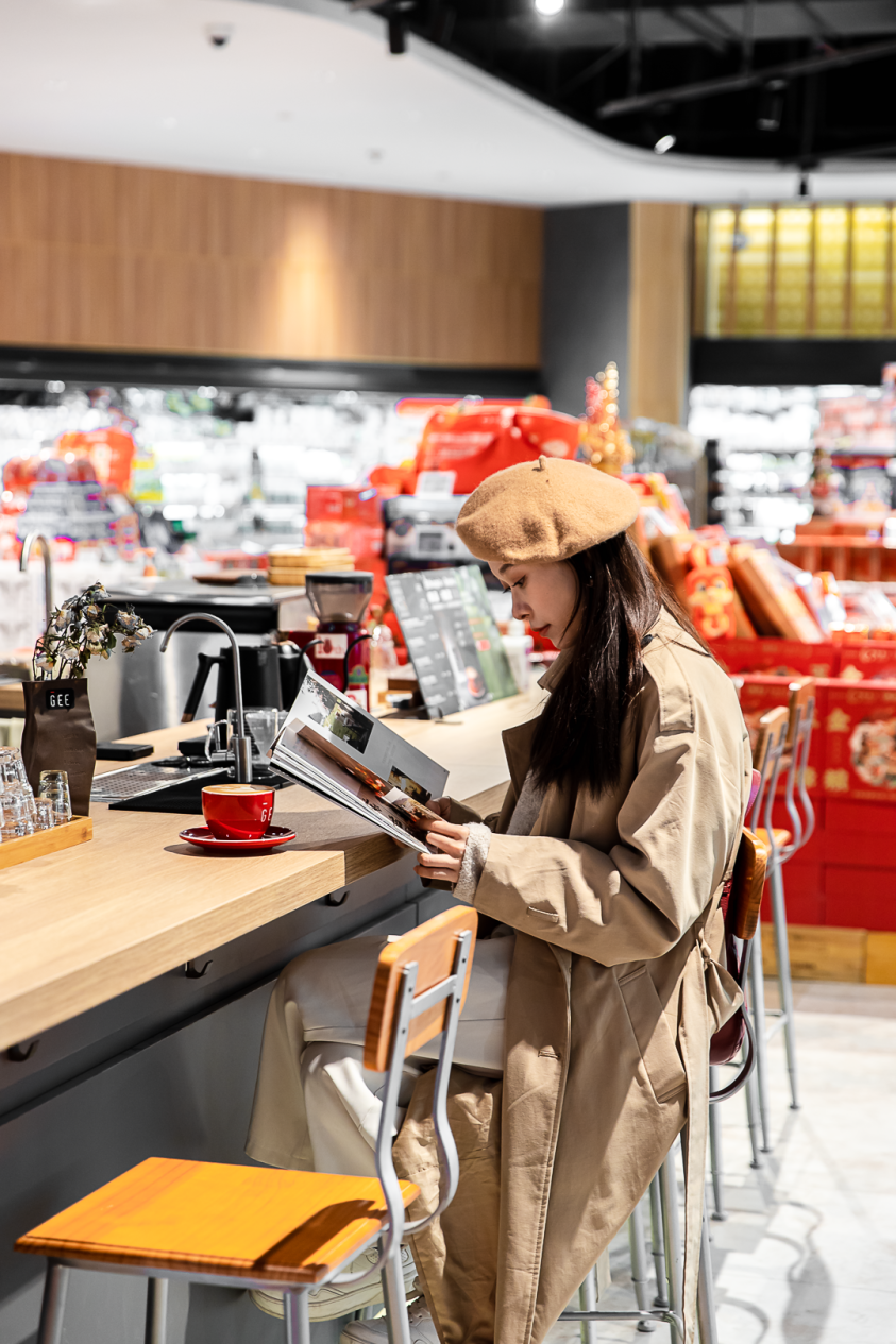 更让人惊喜的是,这里不仅能逛,还能随时坐下来喝杯咖啡。精品咖啡品牌GEE COFFEE在烘焙区旁打造了一个开放式咖啡空间,尽管周围推着手推车的人来来往往,坐在这里也依旧十分舒适。