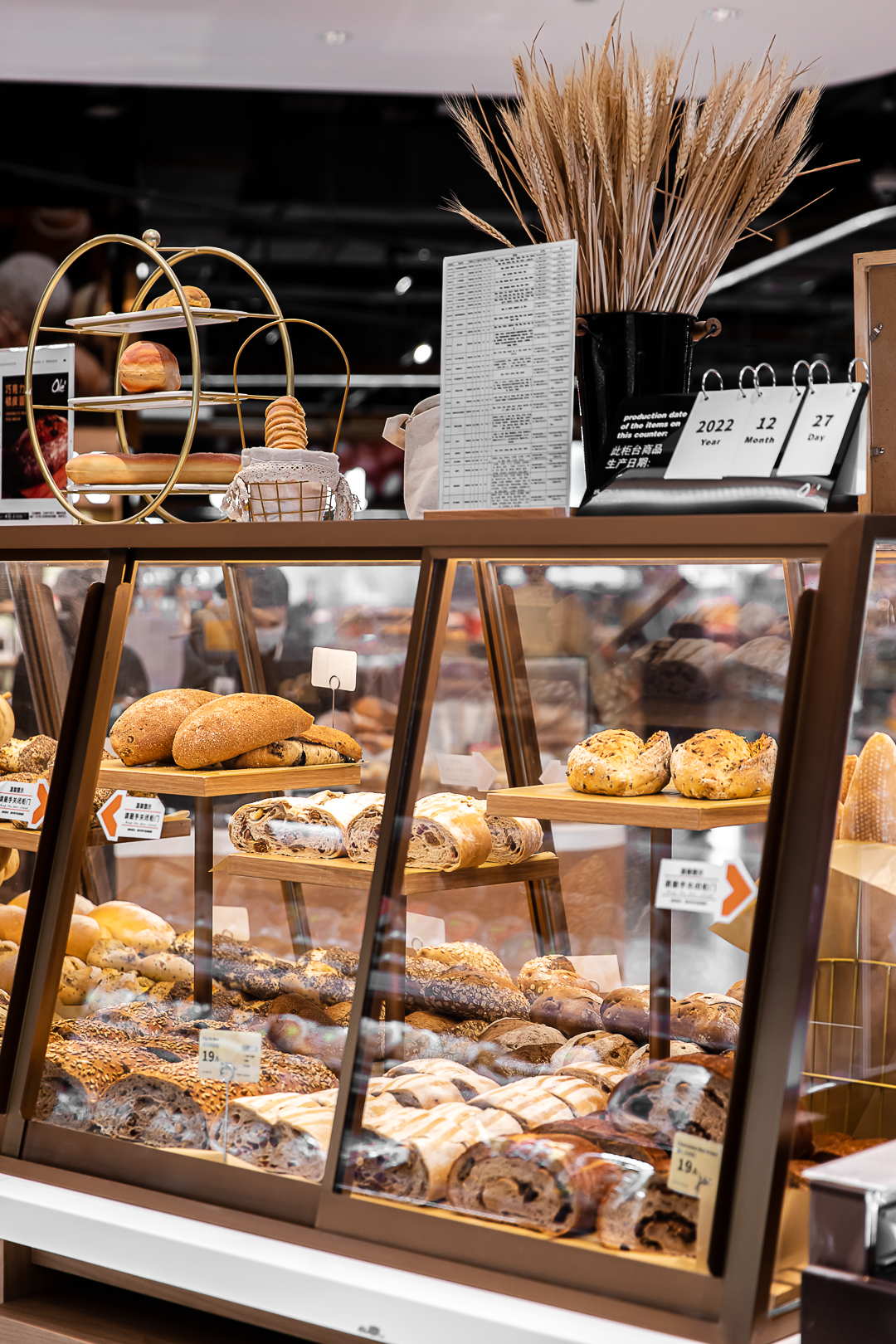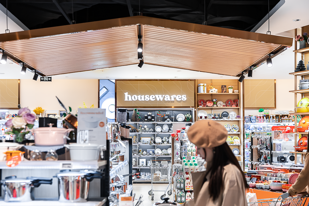 进门左方是很受欢迎的烘焙区,主要售卖各式欧式面包。异形灯箱结合地面水磨石瓷砖烘托出简欧风格,墙面的木纹板让整个空间铺满暖木色,就像钻进了冬日欧洲小镇的面包坊。其他区域也增添了不少用心设计,比如家居区内安置了一个木质三角屋顶,地面则以暖色木纹地砖相衬,氛围温馨舒适,可以放松下来慢慢挑选家用好物。![]()