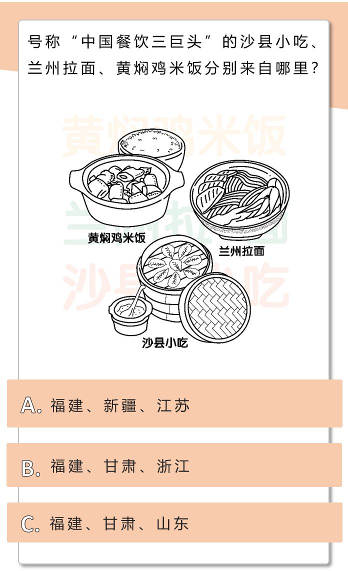 解析:沙县小吃来自福建、兰州拉面来自甘肃,而黄焖鸡米饭是鲁菜名吃,源自山东济南天桥区的传统名吃。