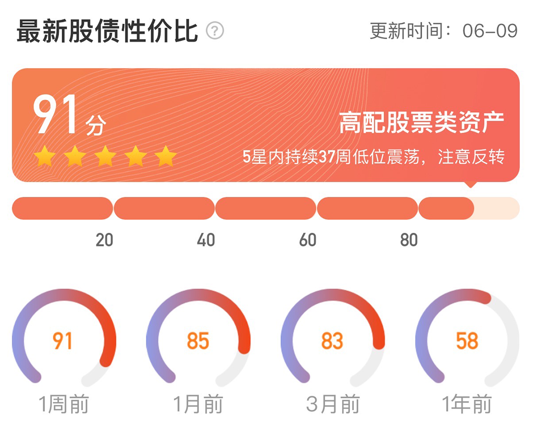 当下股债性价比得分91,位于五星区间,相较于3个月前的83分、1年前的58分,股票类资产性价比凸显,是一个非常值得关注的信号。