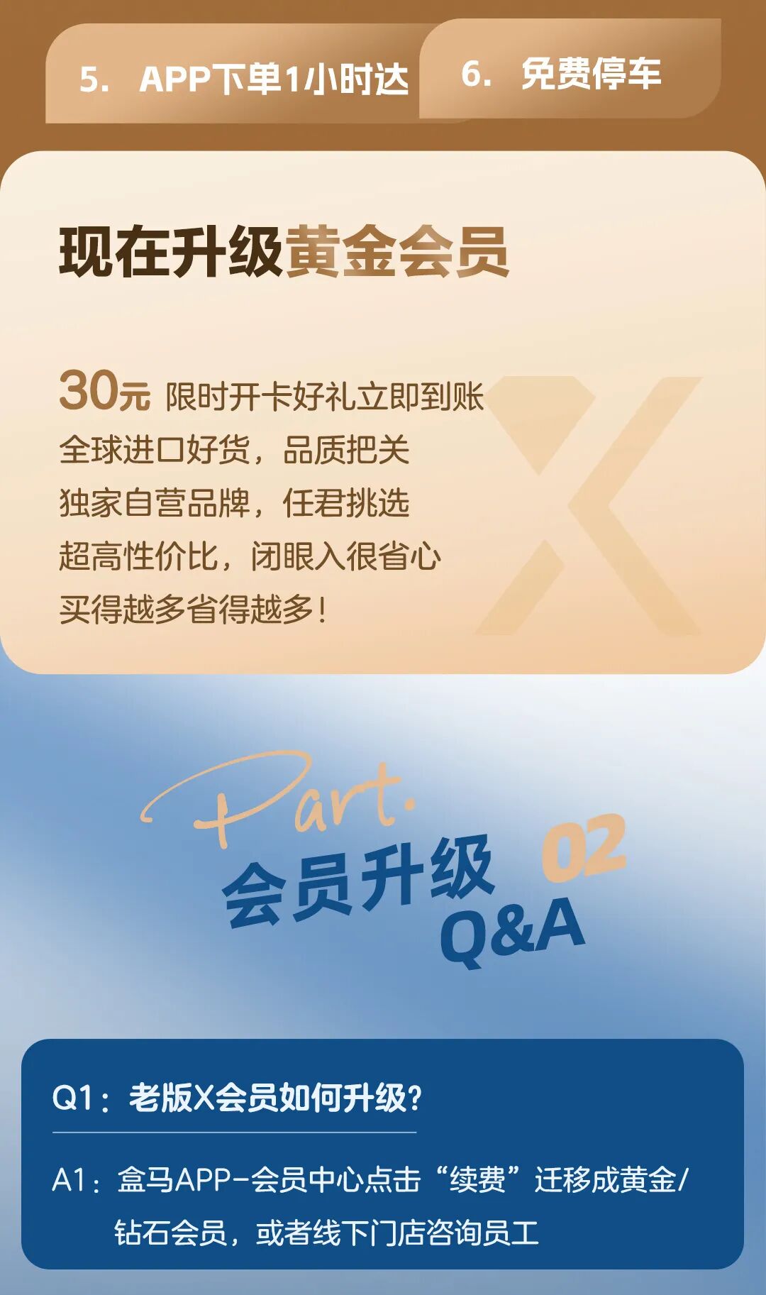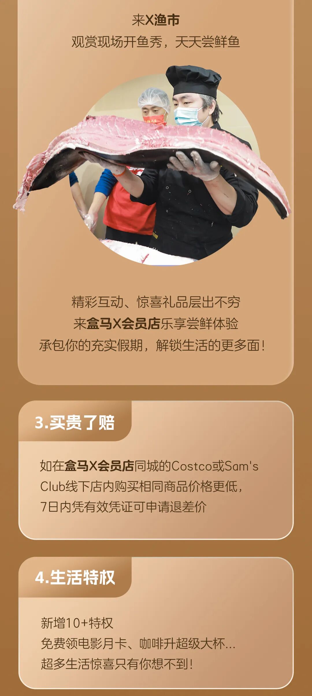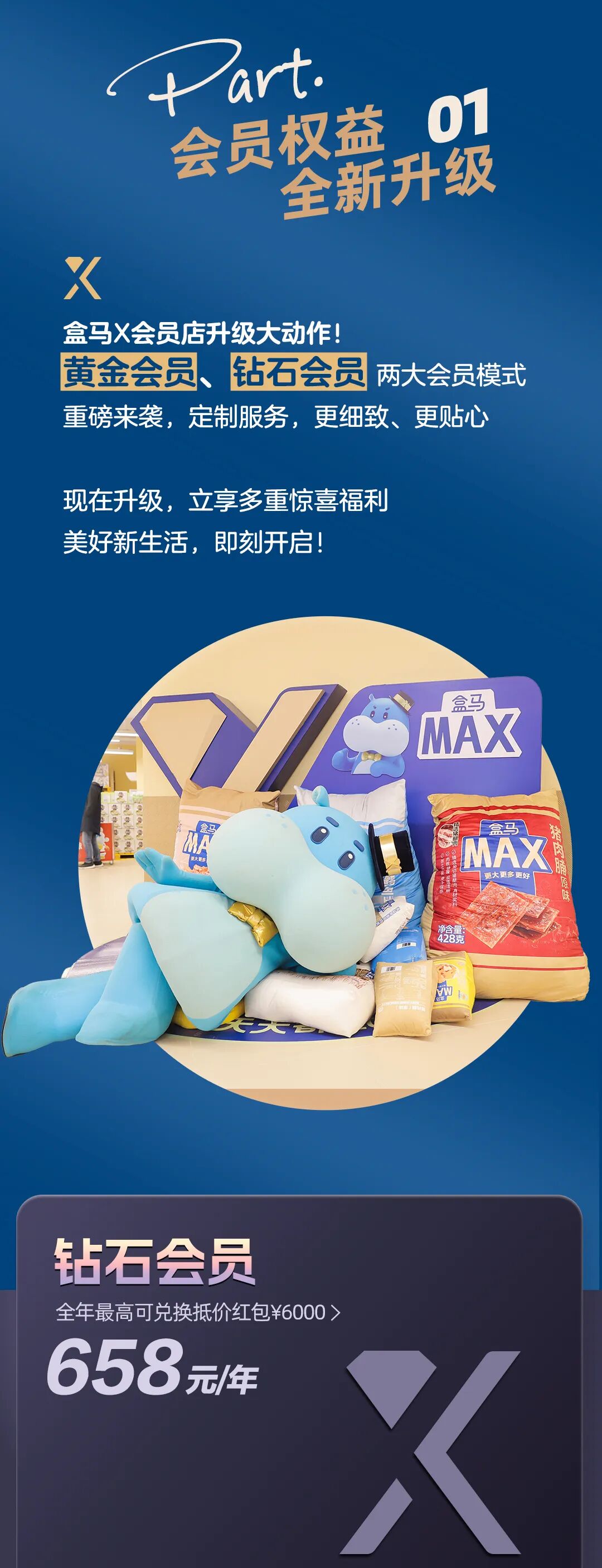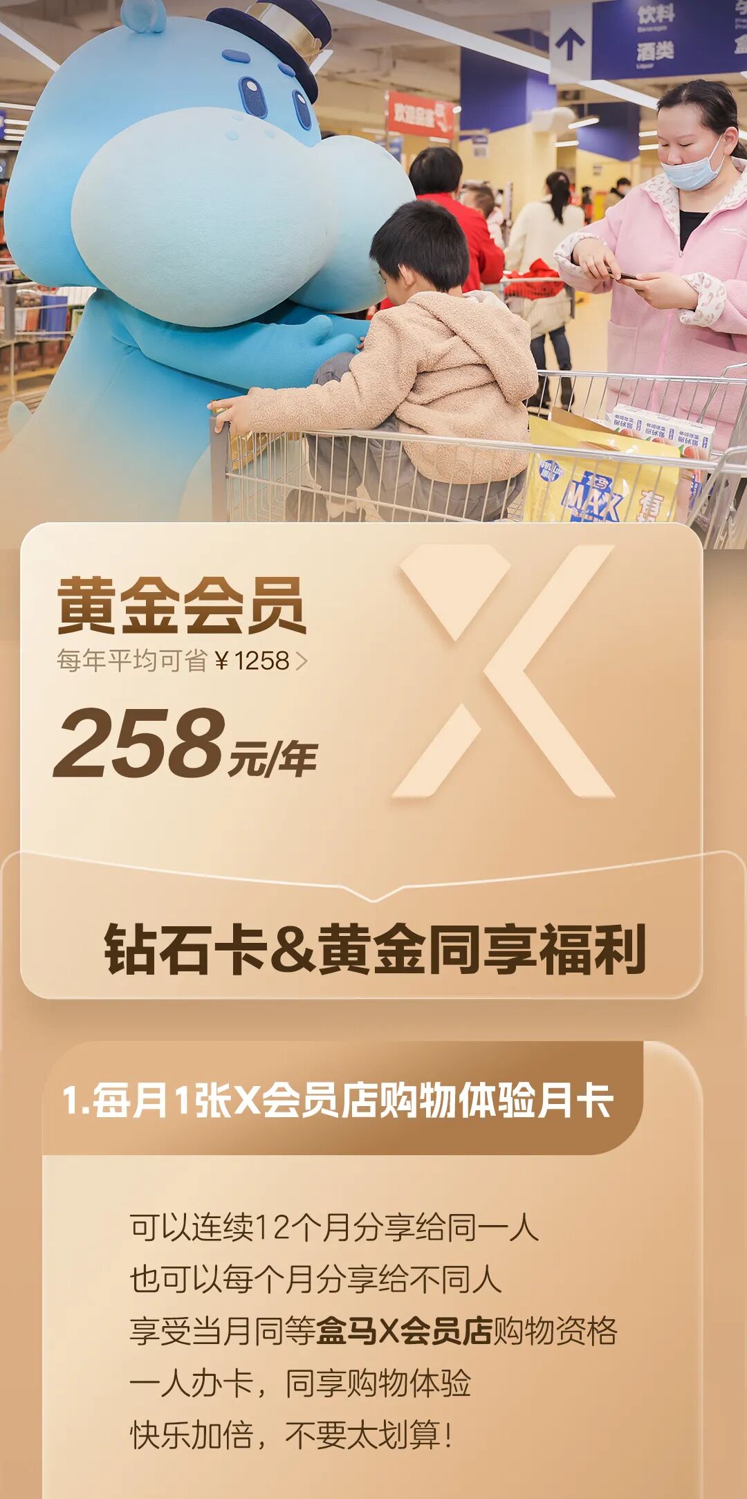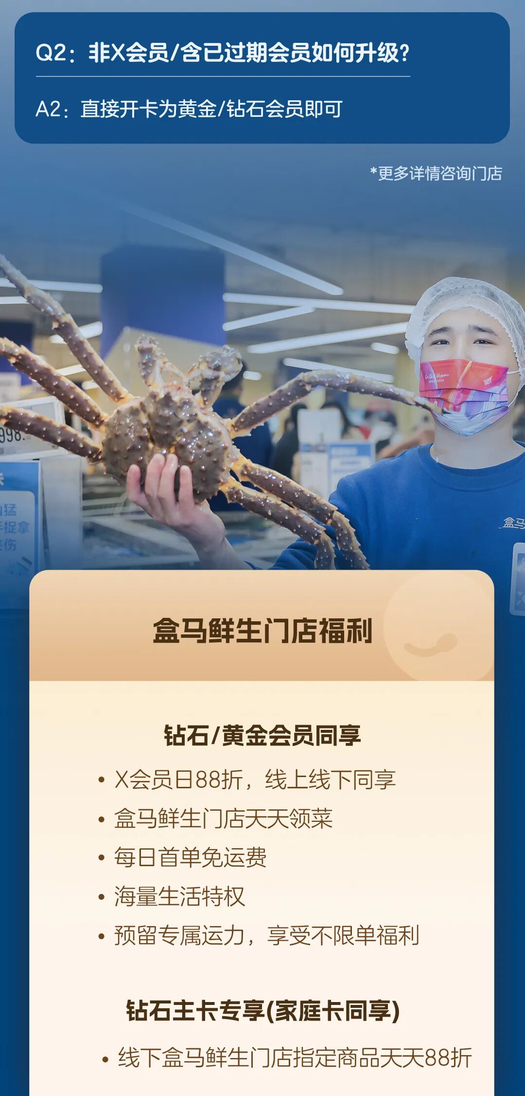 *部分权益仅限在开设有X会员店且开通了X黄金会员/X钻石会员的试行区域内使用,更多权益详情详见《盒马X会员/黄金会员/X钻石会员权益细则》,用户可登陆盒马APP,通过【我的-客服小蜜】搜索“X黄金会员”或“X钻石会员”查询了解。