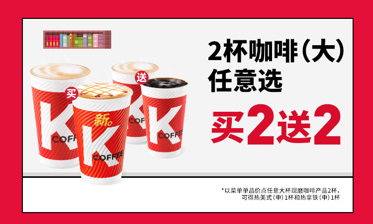 2023年1月1日-12月31日,企业申请开通企业送账户后,在【肯德基APP-企业专送】订餐,单笔订单产品实付金额满300元可享结算金额减30元优惠,或实付金额满600元可享结算金额减80元优惠,或实付金额满2000元可享结算金额减300元优惠。以菜单单品价点购任意大杯现磨咖啡产品2杯,可得热美式(中)1杯和热拿铁(中)1杯。单笔订单点购产品实付金额满100元(不含外送费)可免外送费。省33元是指:该套餐优惠价比相应产品的菜单单品总价可省的金额。仅限肯德基企业专送送餐范围和服务时间,部分送餐区域不参加活动,不同送餐区域的服务时间有异,详情以输入送餐地址后显示的企业专送菜单及送餐时间为准。产品及包装以实物为准。不与其他优惠共享。详情请见肯德基APP【企业专送】。