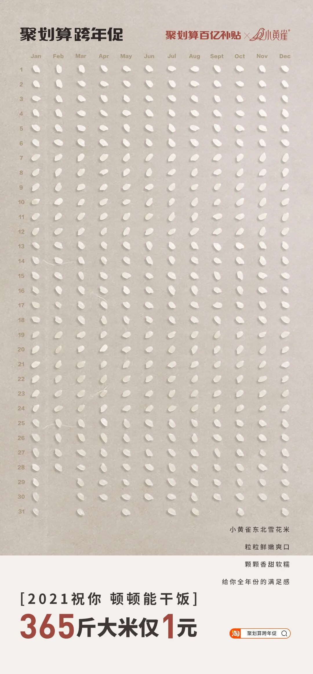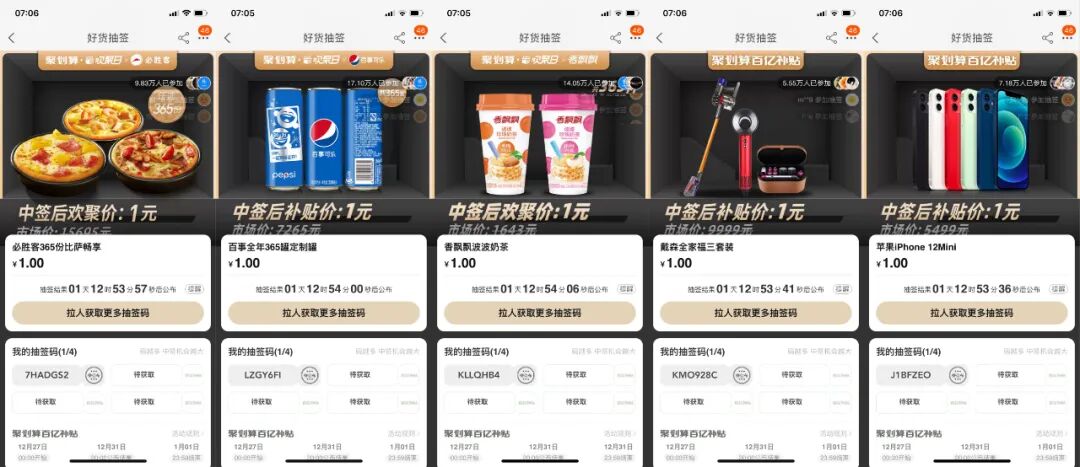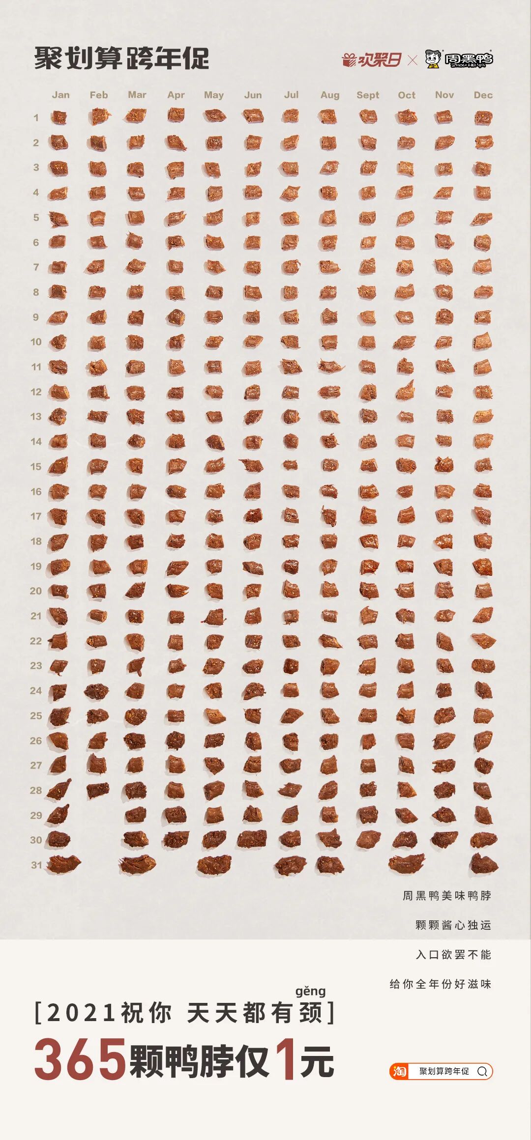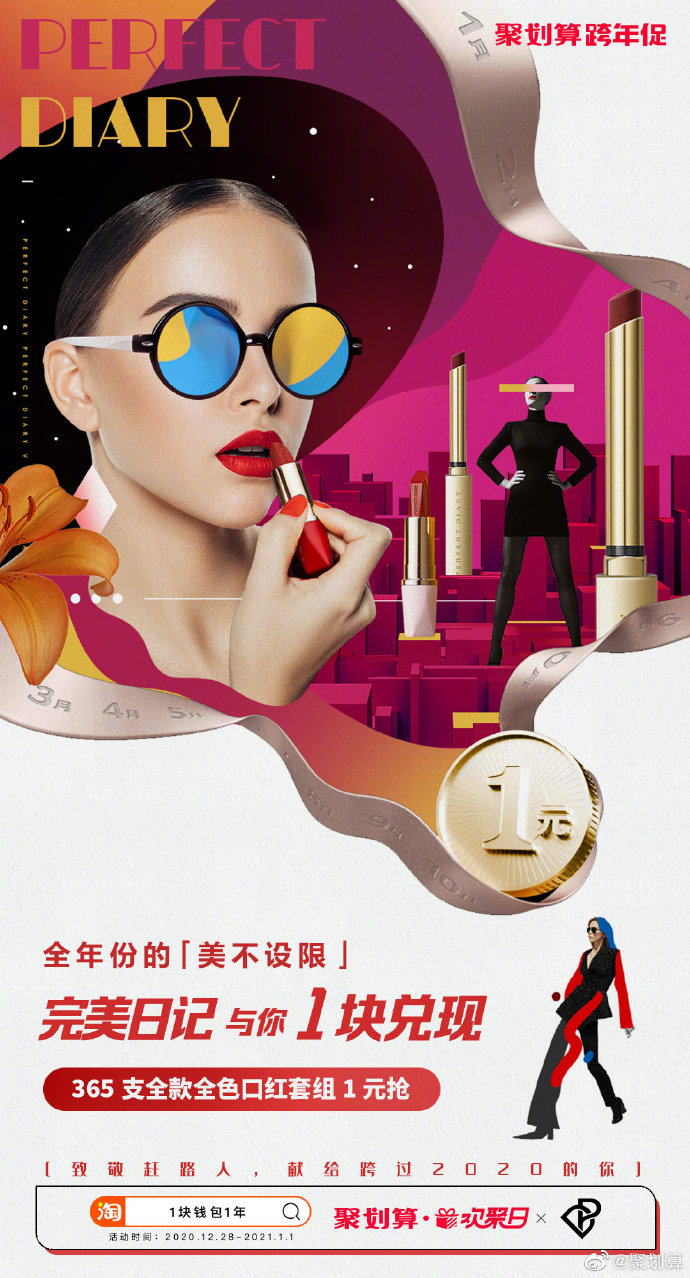 一般人谁能抵挡“诱惑”如此大的魔性?反正阿广缴械了。与魔性的“1块钱包1年”一脉相承的是魔性的货品海报。如果说前者是用促销活动的“干货满满”吸引客户,那么海报图则是从视觉角度冲击着消费者的神经,以阿广开头提到的套套为例。海报图十分具有震撼力,以2021年的完整日历为图片背景, 再以365个套套填满这张本该被一个个日期覆盖的日历。从最终的视觉效果来看,这些套套形状不一、颜色各异,既给人真实、震撼、恢弘的画面感,又让人感到活动的福利货真价实。类似的还有365个唇印、365颗鸭脖、365粒大米、365片牛排等构图创意。当然,要将魔性进行到底,光有画面是不够的,文案也极其重要,阿广这里摘取5个货品的文案大家自行体验:时时都完美——这里的“完美”,既指完美日记,又指女性的完美。因此“时时都完美”,既可以理解为女性每时每刻都需要完美日记品牌产品的陪伴,又指女性每时每刻都应该保持完美的状态。天天都有颈(geng)——这里的“颈(geng)”,既指周黑鸭的招牌品类——鸭脖颈;同时,“颈(geng)”又是“梗”的谐音,也是周黑鸭品牌祝福消费者生活快乐有梗。顿顿能干饭——既可以理解为小黄雀品牌的米饭好,以至于大家每顿都吃得很香;同时也可以理解为,这是结合年度热词“干饭”,表达对大家的美好祝愿:2021年身体健康、心情快乐地生活。日日有鲜肉——从字面意思看,这句话是说生猛海霸品牌的牛肉很新鲜,值得购买;同时,这句话让人联想到时代热词“小鲜肉”,寓意品牌希望大家永葆青春、永远像小鲜肉们一样年轻好看。看完这波魔性货品,阿广也有点冲动了,但还是先冷静地总结下聚划算联合品牌的这波魔性营销吧:这波货品之所以如此具有魔性,主要在于它们的营销创意缤纷多彩,有融梗的,有造梗的,有一语双关的,有蹭年度热词热度的……方式有别,但效果相同,使得这些货品充满浓郁的时代气息,切中2020的年度情绪。——这或许就是这波货品魔性爆棚的深层次原因。制作海报有无数种创意,但是这种做法也是真的“魔性”了。看到这些海报幕后“施工图”的瞬间,阿广心里油然而生一股敬意。真是应了那句话——创意一时爽,执行火葬场。当然,这是玩笑。或许,正是设计师们幕后这种着了魔的忘我投入,才成就了惊艳一时的魔性货品海报吧。曾几何时,“我觉得生命最重要的不是金钱,而是可以在阳光下呼吸新鲜的空气”式鸡汤,还颇受欢迎,然而在艰难的2020年里,想外出大口大口呼吸空气却成了一件奢侈的事情。而就在这时,聚划算跨年促活动以“献给每“1”位赶路人”为口号,瞬间蹿红。阿广认为,聚划算跨年促活动蹿红,也是胜在口号“献给每“1”位赶路人”的讨喜上。对于这种“讨喜”,我们可以从走脑和走心两个维度来看:这里的“1”,既是“365件好货1元抢”、“1块兑现”中的“1”,也是2020年“每一位赶路人”中的“一”。这句简单的口号,以数字“1”和“一”的巧妙融合,实现此次聚划算跨年促的最大吸睛点(365件好货1元抢)与每一个消费者(赶路人)之间的巧妙关联,颇有创意。“献给每“1”位赶路人”——也是聚划算平台和各品牌,与消费者共同完成的一次年终仪式。这一年,大家都很难,但是每一个消费者都是没有停下脚步的赶路人。在这告别2020之际,聚划算平台和各品牌能够体察到大家这一年赶路的难,并向他们致敬和献礼,抓住了每一个人的情感“软肋”, 挠中了人民群众情感的“痒”点。因此,聚划算这句简单的口号通过与消费者共情,赚足了好感。聚划算此次跨年促不仅着了“魔”,还挺好“玩”——这里指的是整个活动中的游戏部分——小聚跨栏。而也是这波游戏动作,进一步助推了整场活动的大火。通过玩游戏用户互动的活动多了,聚划算这波主要打出了两个差异点:一方面,从游戏场景看,小聚跨栏的“跨栏”场景象征着每个人在2020的处境和应对:这一年,我们的工作或生活都不可避免地被一些“栏”阻挡,但我们一路跨“栏”,走到了2020年末。就这样,小聚跨栏游戏将游戏场景与真实生活关联,强化用户情感代入,圈粉无数。另一方面,游戏中引入了跨栏飞人的人物设定。尽管遭遇人生低谷和质疑,但刘翔没有跌倒后一蹶不振,依旧奔跑在人生新的赛道。作为一代人励志偶像的刘翔,能够在游戏中激起我们跨栏、跨越一切障碍的勇气。这既传递了正能量,也塑造了用户对平台的正面认可。当然,游戏中陪着用户一起玩的章鱼小聚,在增添游戏趣味性和好运寓意的同时,也借助人格化的IP形象提升了用户对聚划算平台的亲近感。聚划算联合众多品牌策划的这次活动,借助魔性货品和互动游戏,在跨年的时间节点引导消费者体验了一次有仪式感的“购物狂欢”。一方面,以货品的干货满满和魔性营销,打造出整场活动基本盘;另一方面,运用游戏互动,通过强化用户情感代入、传递正能量以及植入平台人格化IP形象,完美实现了平台、品牌和消费者三方之间的深度互动。这既塑造了聚划算平台在客户端的生动形象,同时也成功完成了平台吸引“新流量”、盘活“旧流量”的商业目标。从以上两方面看,聚划算这波跨年营销,确实“活儿不错”。![]()