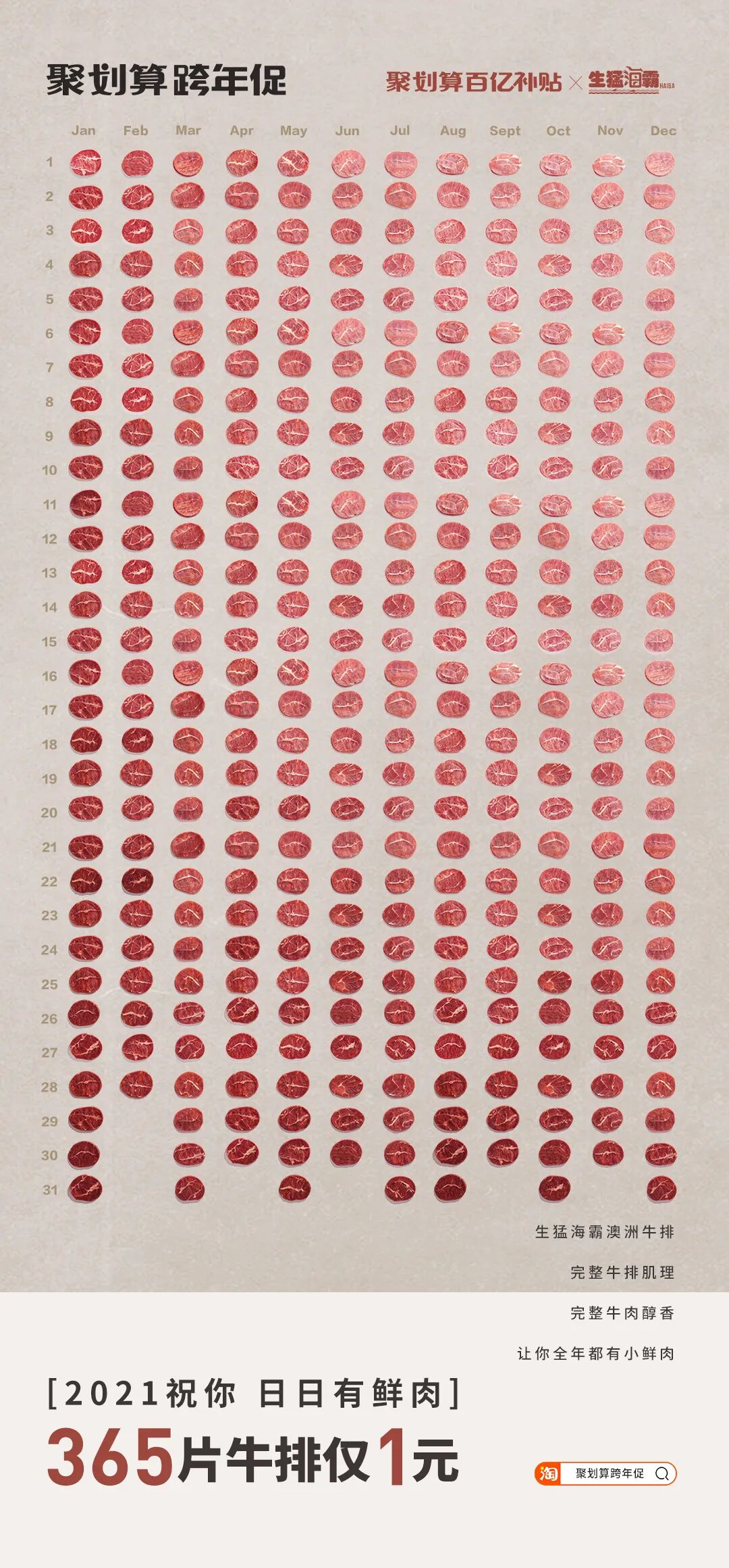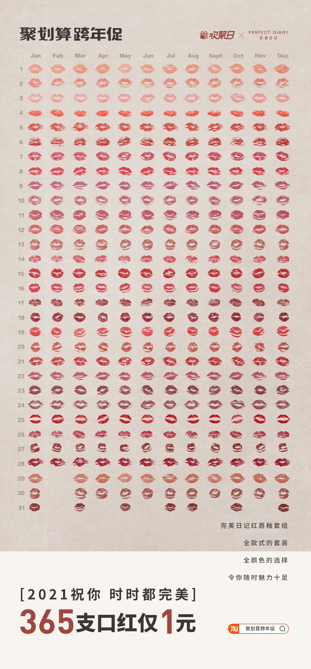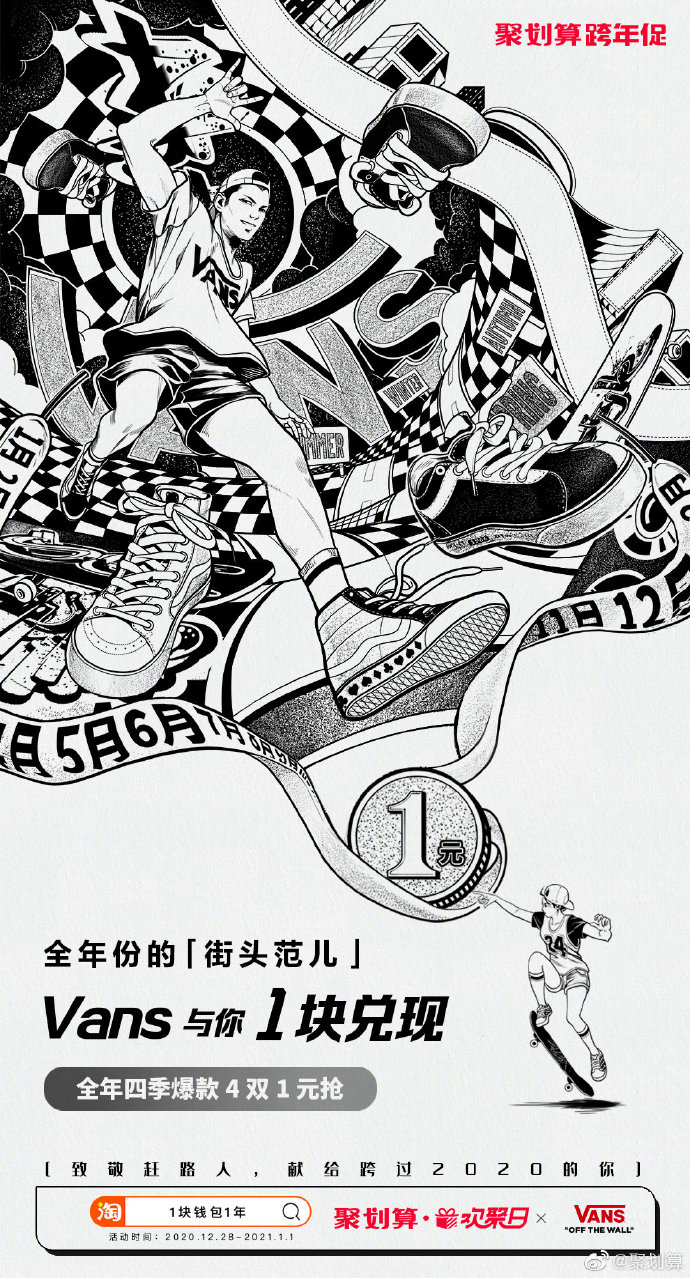 一般人谁能抵挡“诱惑”如此大的魔性?反正阿广缴械了。与魔性的“1块钱包1年”一脉相承的是魔性的货品海报。如果说前者是用促销活动的“干货满满”吸引客户,那么海报图则是从视觉角度冲击着消费者的神经,以阿广开头提到的套套为例。海报图十分具有震撼力,以2021年的完整日历为图片背景, 再以365个套套填满这张本该被一个个日期覆盖的日历。从最终的视觉效果来看,这些套套形状不一、颜色各异,既给人真实、震撼、恢弘的画面感,又让人感到活动的福利货真价实。类似的还有365个唇印、365颗鸭脖、365粒大米、365片牛排等构图创意。当然,要将魔性进行到底,光有画面是不够的,文案也极其重要,阿广这里摘取5个货品的文案大家自行体验:时时都完美——这里的“完美”,既指完美日记,又指女性的完美。因此“时时都完美”,既可以理解为女性每时每刻都需要完美日记品牌产品的陪伴,又指女性每时每刻都应该保持完美的状态。天天都有颈(geng)——这里的“颈(geng)”,既指周黑鸭的招牌品类——鸭脖颈;同时,“颈(geng)”又是“梗”的谐音,也是周黑鸭品牌祝福消费者生活快乐有梗。顿顿能干饭——既可以理解为小黄雀品牌的米饭好,以至于大家每顿都吃得很香;同时也可以理解为,这是结合年度热词“干饭”,表达对大家的美好祝愿:2021年身体健康、心情快乐地生活。日日有鲜肉——从字面意思看,这句话是说生猛海霸品牌的牛肉很新鲜,值得购买;同时,这句话让人联想到时代热词“小鲜肉”,寓意品牌希望大家永葆青春、永远像小鲜肉们一样年轻好看。看完这波魔性货品,阿广也有点冲动了,但还是先冷静地总结下聚划算联合品牌的这波魔性营销吧:这波货品之所以如此具有魔性,主要在于它们的营销创意缤纷多彩,有融梗的,有造梗的,有一语双关的,有蹭年度热词热度的……方式有别,但效果相同,使得这些货品充满浓郁的时代气息,切中2020的年度情绪。——这或许就是这波货品魔性爆棚的深层次原因。制作海报有无数种创意,但是这种做法也是真的“魔性”了。看到这些海报幕后“施工图”的瞬间,阿广心里油然而生一股敬意。真是应了那句话——创意一时爽,执行火葬场。当然,这是玩笑。或许,正是设计师们幕后这种着了魔的忘我投入,才成就了惊艳一时的魔性货品海报吧。曾几何时,“我觉得生命最重要的不是金钱,而是可以在阳光下呼吸新鲜的空气”式鸡汤,还颇受欢迎,然而在艰难的2020年里,想外出大口大口呼吸空气却成了一件奢侈的事情。而就在这时,聚划算跨年促活动以“献给每“1”位赶路人”为口号,瞬间蹿红。阿广认为,聚划算跨年促活动蹿红,也是胜在口号“献给每“1”位赶路人”的讨喜上。对于这种“讨喜”,我们可以从走脑和走心两个维度来看:这里的“1”,既是“365件好货1元抢”、“1块兑现”中的“1”,也是2020年“每一位赶路人”中的“一”。这句简单的口号,以数字“1”和“一”的巧妙融合,实现此次聚划算跨年促的最大吸睛点(365件好货1元抢)与每一个消费者(赶路人)之间的巧妙关联,颇有创意。“献给每“1”位赶路人”——也是聚划算平台和各品牌,与消费者共同完成的一次年终仪式。这一年,大家都很难,但是每一个消费者都是没有停下脚步的赶路人。在这告别2020之际,聚划算平台和各品牌能够体察到大家这一年赶路的难,并向他们致敬和献礼,抓住了每一个人的情感“软肋”, 挠中了人民群众情感的“痒”点。因此,聚划算这句简单的口号通过与消费者共情,赚足了好感。聚划算此次跨年促不仅着了“魔”,还挺好“玩”——这里指的是整个活动中的游戏部分——小聚跨栏。而也是这波游戏动作,进一步助推了整场活动的大火。通过玩游戏用户互动的活动多了,聚划算这波主要打出了两个差异点:一方面,从游戏场景看,小聚跨栏的“跨栏”场景象征着每个人在2020的处境和应对:这一年,我们的工作或生活都不可避免地被一些“栏”阻挡,但我们一路跨“栏”,走到了2020年末。就这样,小聚跨栏游戏将游戏场景与真实生活关联,强化用户情感代入,圈粉无数。另一方面,游戏中引入了跨栏飞人的人物设定。尽管遭遇人生低谷和质疑,但刘翔没有跌倒后一蹶不振,依旧奔跑在人生新的赛道。作为一代人励志偶像的刘翔,能够在游戏中激起我们跨栏、跨越一切障碍的勇气。这既传递了正能量,也塑造了用户对平台的正面认可。当然,游戏中陪着用户一起玩的章鱼小聚,在增添游戏趣味性和好运寓意的同时,也借助人格化的IP形象提升了用户对聚划算平台的亲近感。聚划算联合众多品牌策划的这次活动,借助魔性货品和互动游戏,在跨年的时间节点引导消费者体验了一次有仪式感的“购物狂欢”。一方面,以货品的干货满满和魔性营销,打造出整场活动基本盘;另一方面,运用游戏互动,通过强化用户情感代入、传递正能量以及植入平台人格化IP形象,完美实现了平台、品牌和消费者三方之间的深度互动。这既塑造了聚划算平台在客户端的生动形象,同时也成功完成了平台吸引“新流量”、盘活“旧流量”的商业目标。从以上两方面看,聚划算这波跨年营销,确实“活儿不错”。![]()