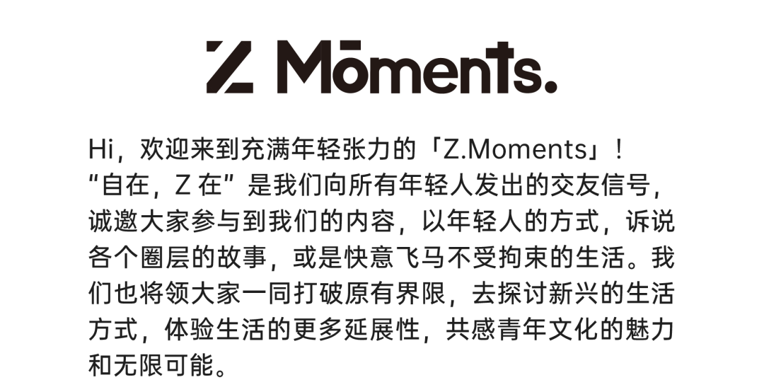 「Z.Moments」希望从关注到理解,从“态度欢迎”到“成为朋友”,聚焦大家共同关注的,讨论大家新兴热爱的,持续传递我们对新青年的友好态度和“永在当下”的年轻精神。