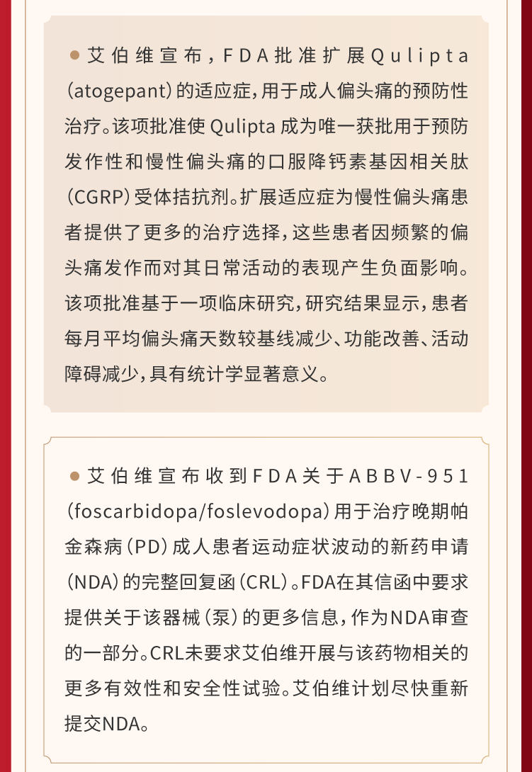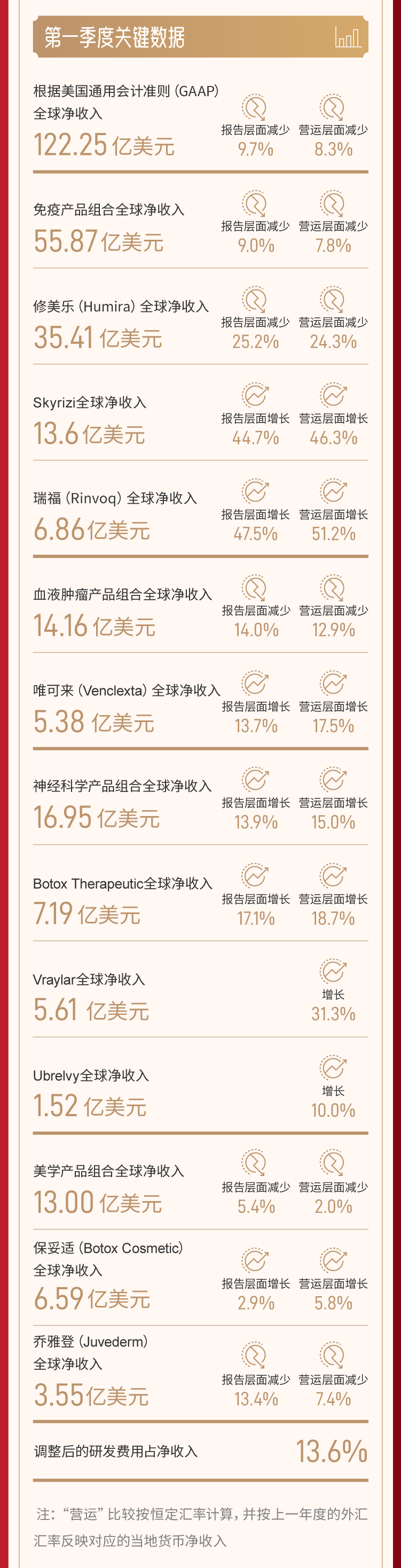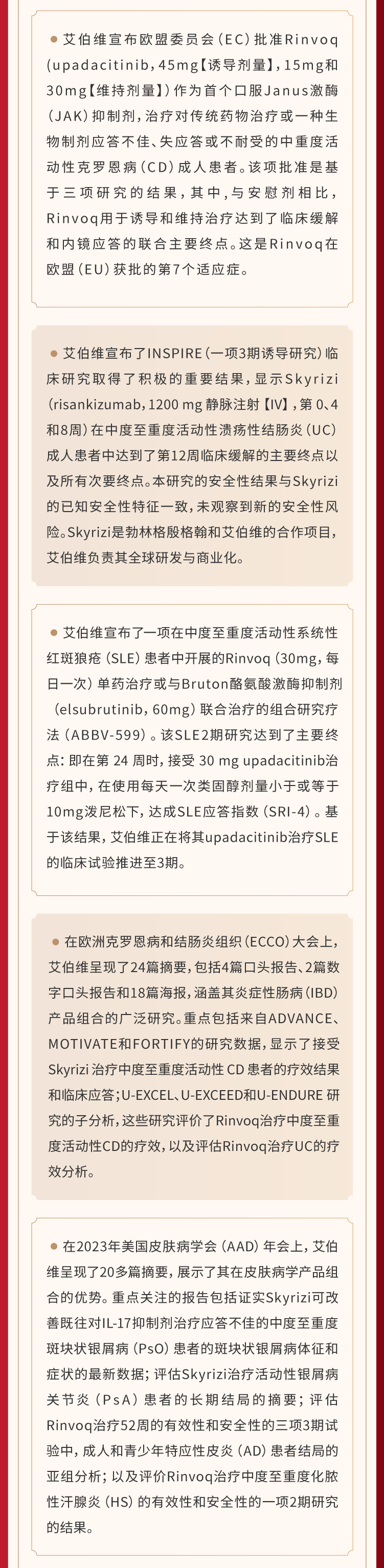 艾伯维的使命是发现和提供创新药物,解决复杂且棘手的疾病难题和未来的医学挑战。我们不懈努力,凭借在多个关键治疗领域的科研创新为人们的生活带来深远影响,包括免疫学、肿瘤学、神经科学、眼科学、病毒学、女性健康、胃肠病学,以及艾尔建美学产品组合中的产品和服务。更多关于艾伯维的信息,请访问www.abbvie.com。