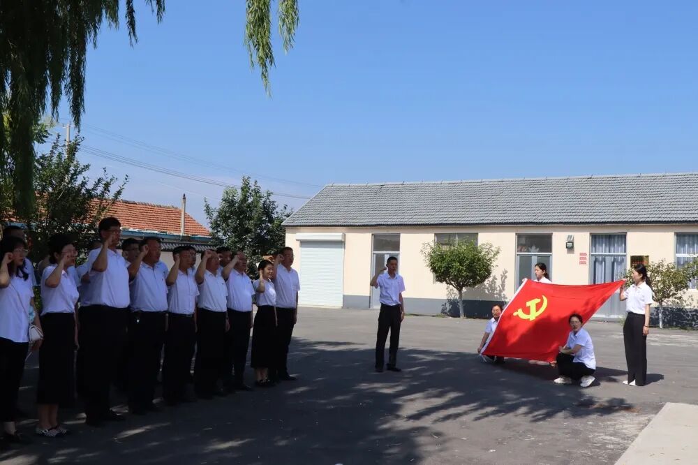 在杨明斋事迹陈列馆前,面对鲜红的党旗,全体党员干部举起右拳,庄严宣誓:“我志愿加入中国共产党……永不叛党!”一句句铿锵有力的誓言,彰显着掷地有声的承诺,诠释着履职尽责的担当,铭刻着笃定终身的执着追求。