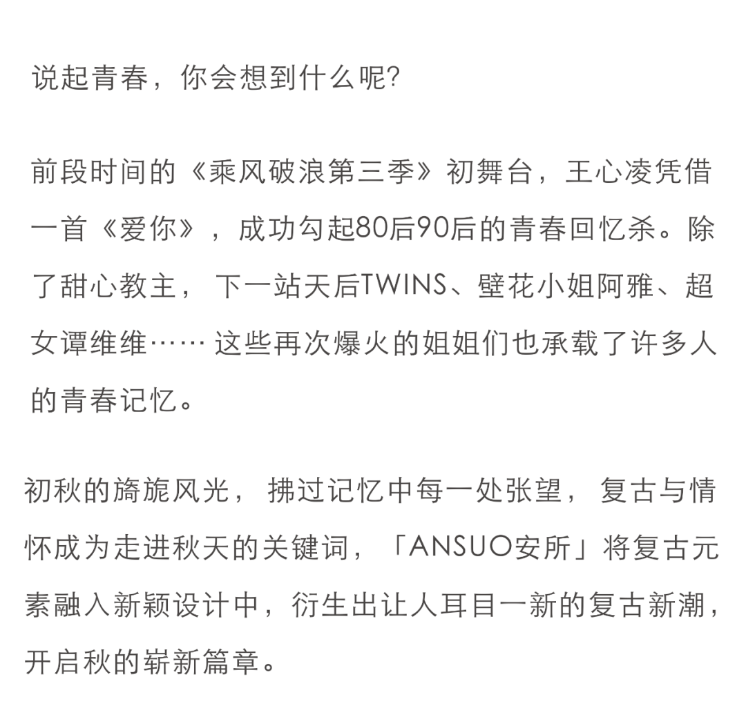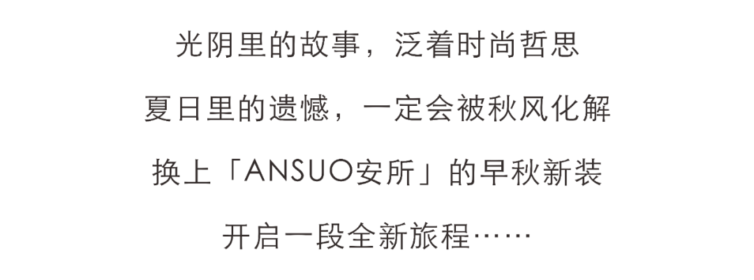 摘要:光阴里的故事,泛着时尚哲思,夏日里的遗憾,一定会被秋风化解,换上「ANSUO安所」的早秋新装,开启一段全新旅程……