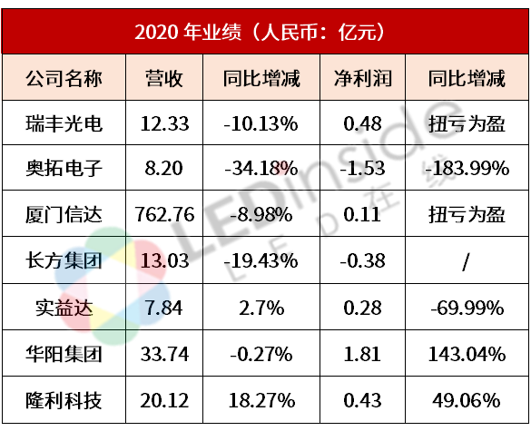 昨(26)日,瑞丰光电、奥拓电子、厦门信达、长方集团、实益达、华阳集团、隆利科技等7家LED企业公布了2020年业绩报告。其中,华阳集团、隆利科技净利润增长,瑞丰光电、厦门信达扭亏为盈。