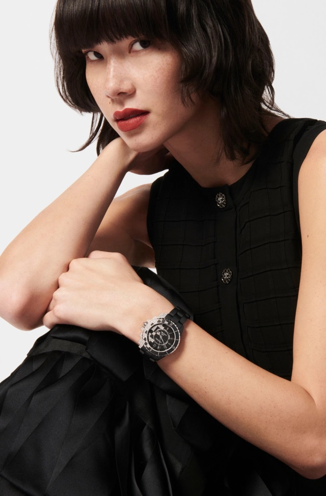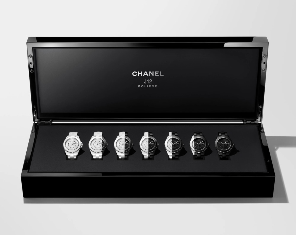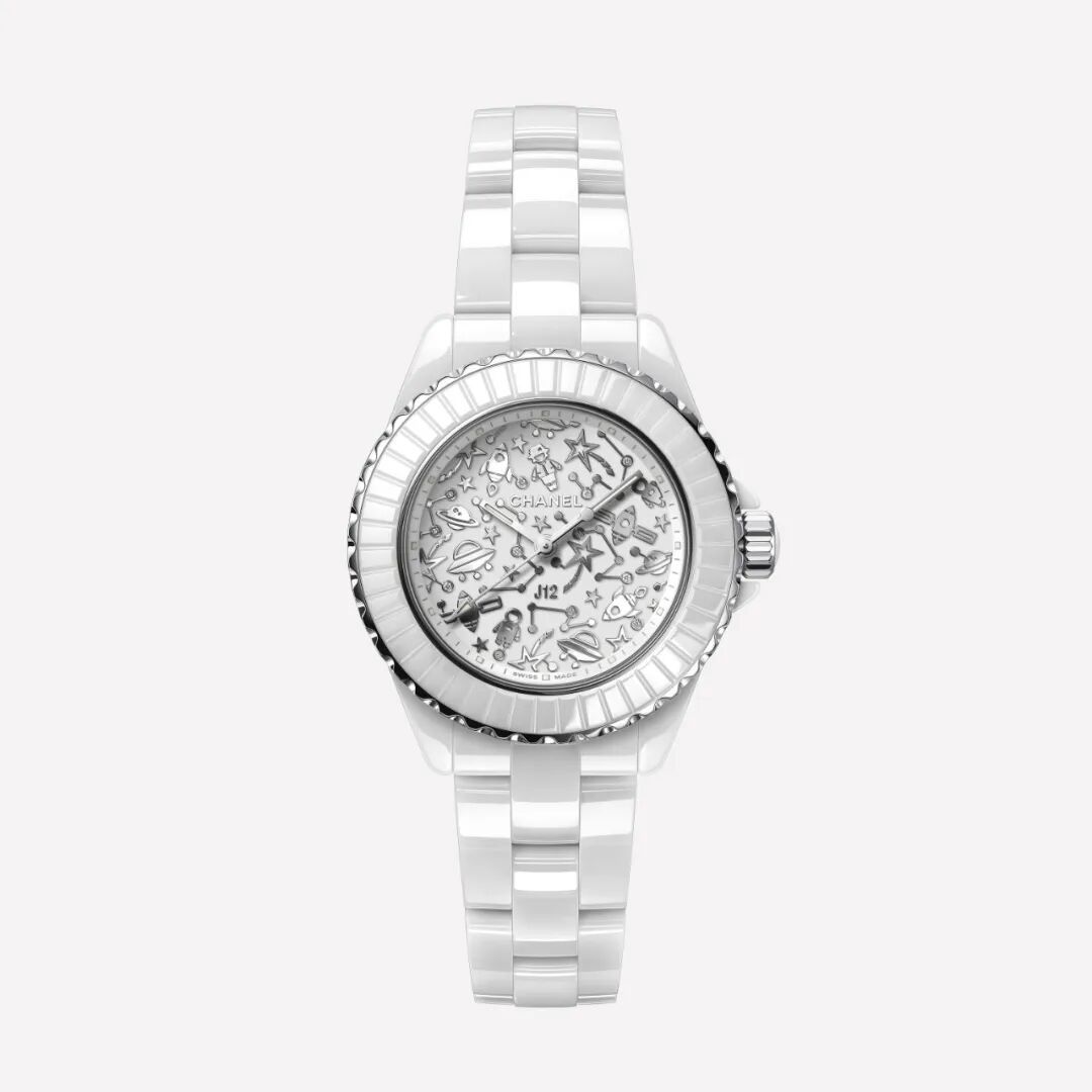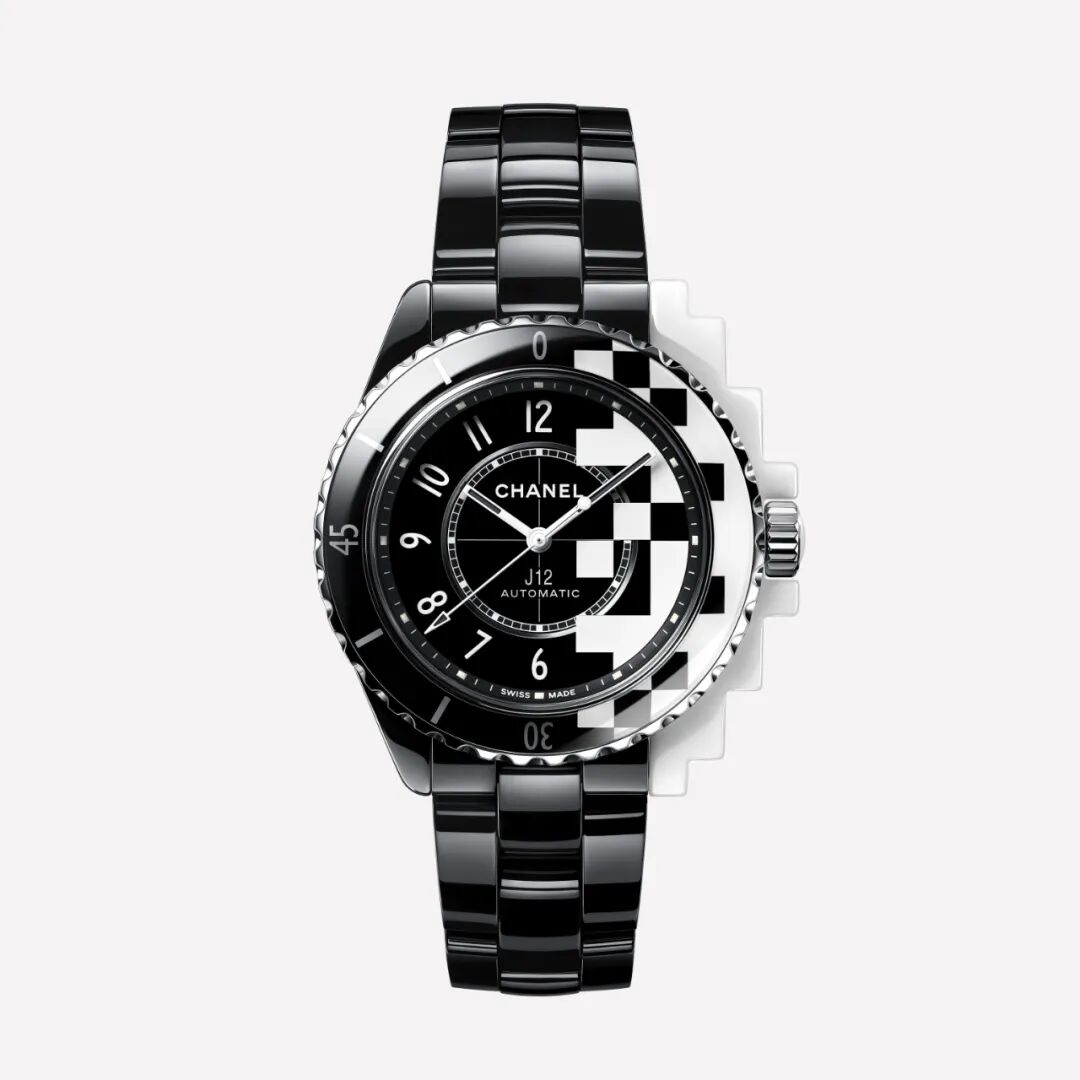 J12 CYBERNETIC腕表,黑色漆面表盘上饰以白色像素图案,图案延伸至表壳,形成独特的阶梯形视觉效果,演绎几何风格的J12腕表。J12 COSMIC腕表荧光表盘饰有缤纷绚丽的宇宙元素,点缀其中的12颗钻石,赋予作品耀眼光芒。以璀璨星光演绎J12腕表。