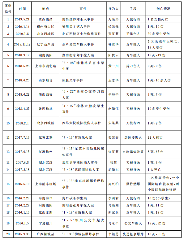 有学者归纳总结了2015-2019年间的20起典型案例,详细梳理每件案例的事发经过及行为人的心理与行为变化历程,从中可以看出个体报复社会行为的一般特质与生成规律。