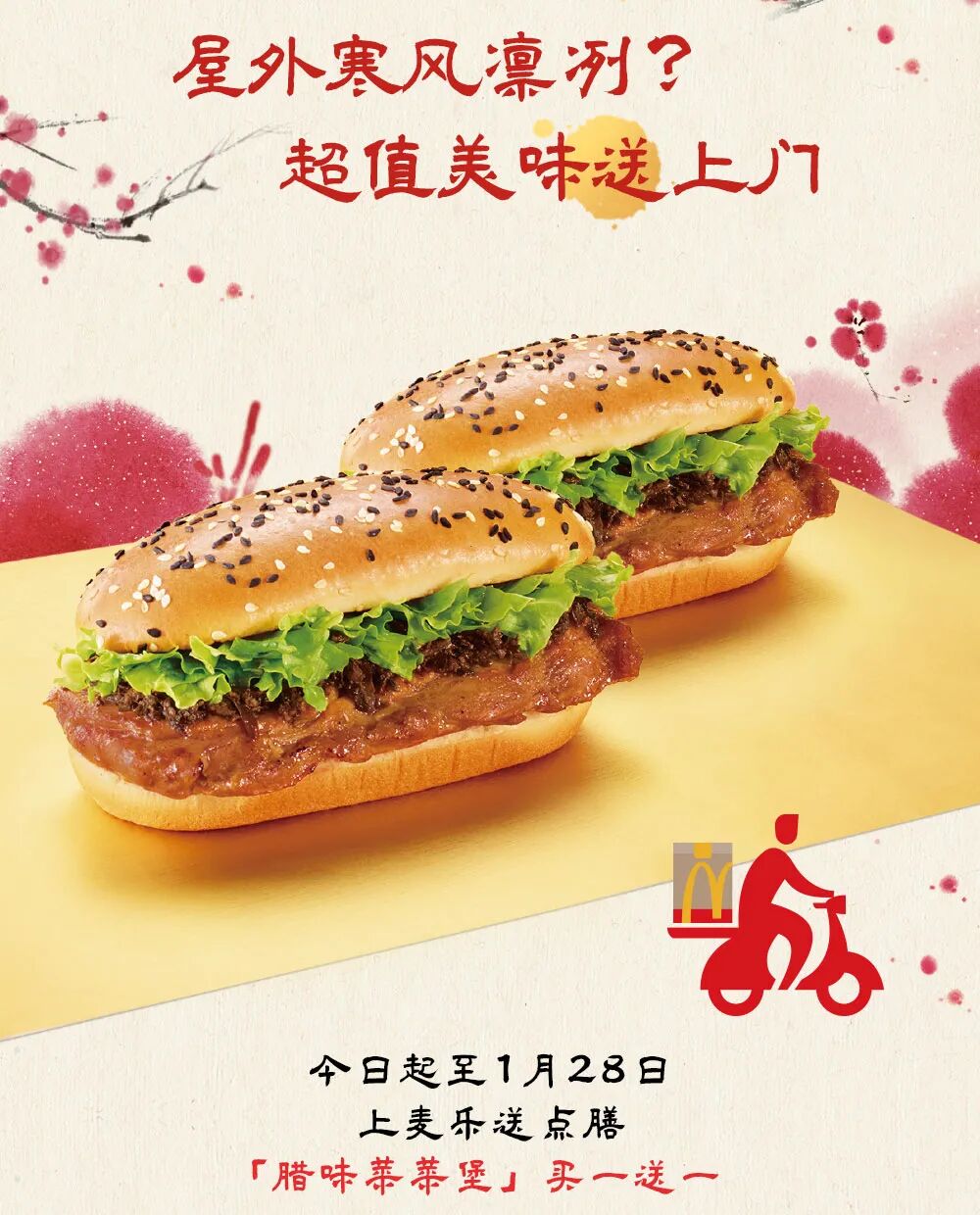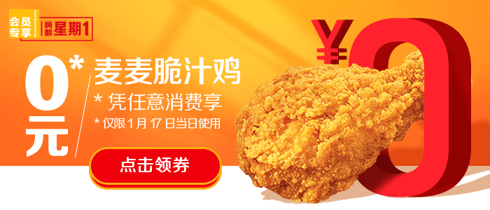 以上活动推广日期自2022年1月12日至2022年2月15日,仅在中国(本活动场景下不包括港澳台地区)部分麦当劳®餐厅适用,具体活动信息以餐厅公示为准。上述产品仅限早餐时段后供应,早餐供应时间以餐厅实际供应情况为准,至上午10:30结束。通过麦乐送®送餐服务、麦当劳APP、微信小程序、自助点餐机、第三方外送平台等渠道点餐的,优惠活动参与情况以各自渠道的图示宣传为准。除食品外,其他物品(包括容器)不在售卖范围。产品本身以外的食物形象仅为装饰目的。如遇产品售罄,餐厅将视餐厅供应情况为您替换为价格相当的产品,以餐厅实际供应为准。麦麦脆汁鸡产品中可能含有骨头,品尝时请您留意。麦麦脆汁鸡产品中含蚕豆粉等调味料。温馨提示:红豆双皮奶风味珍珠奶茶含食用珍珠,勿一口吞食;三岁以下儿童不宜食用;老人儿童须监护下食用。