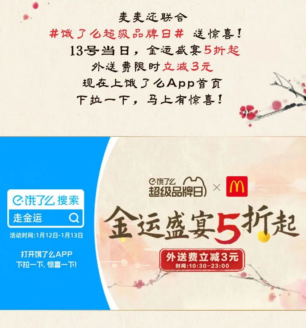 外送费限时优惠活动仅限饿了么的麦乐送®送餐服务适用,以饿了么端点餐页面显示为准。5折优惠活动自2022年1月12日至2月15日,折扣比例是与所含单品的常规单买价相比。