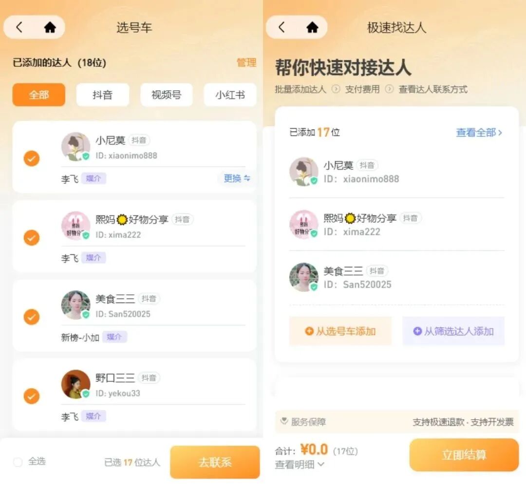 现在企业可以将达人添加至选号车中,批量查看一批达人的联系方式,比起一个个去解锁建联,效率更高。