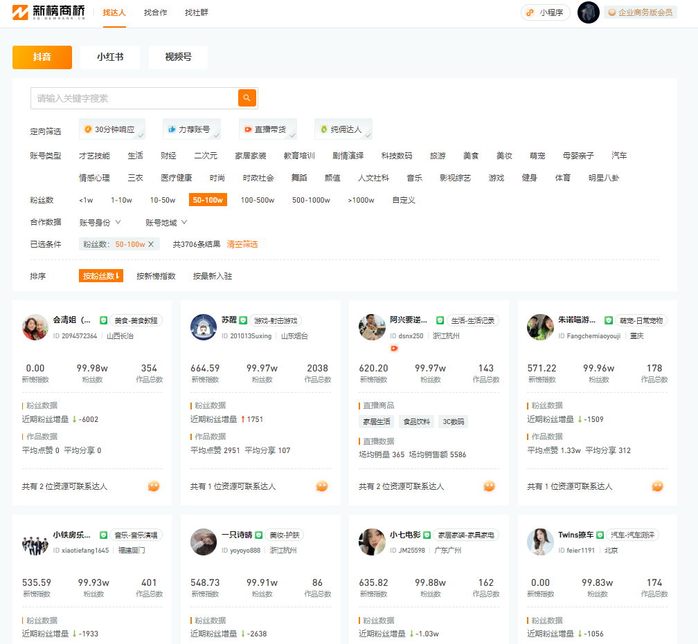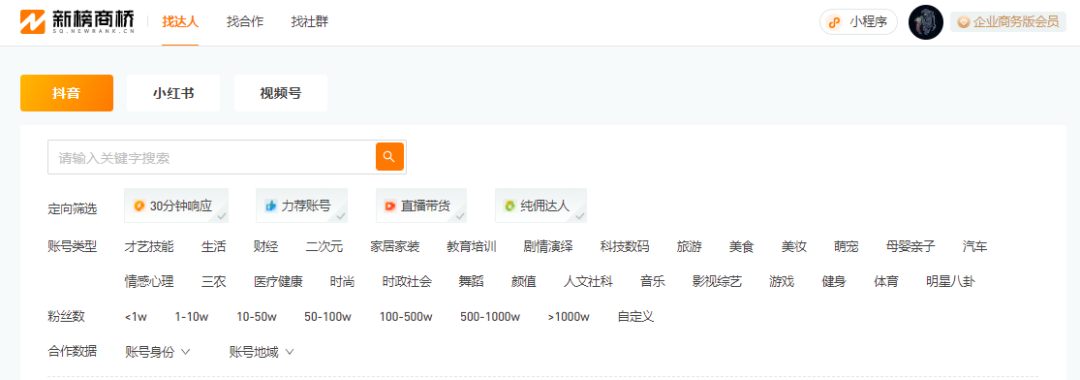 新榜商桥为品牌提供海量达人库,拥有超45w+KOL/KOC资源,其中20w+抖音达人、15w+小红书达人、10w+视频号达人;1000+认证纯佣达人,100+纯佣团长。与各大头部MCN深度合作。