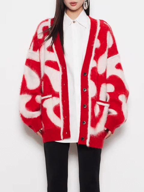这款oversize风V领提花开衫羊驼毛上衣轻薄舒适,经典红白配色年轻活力。