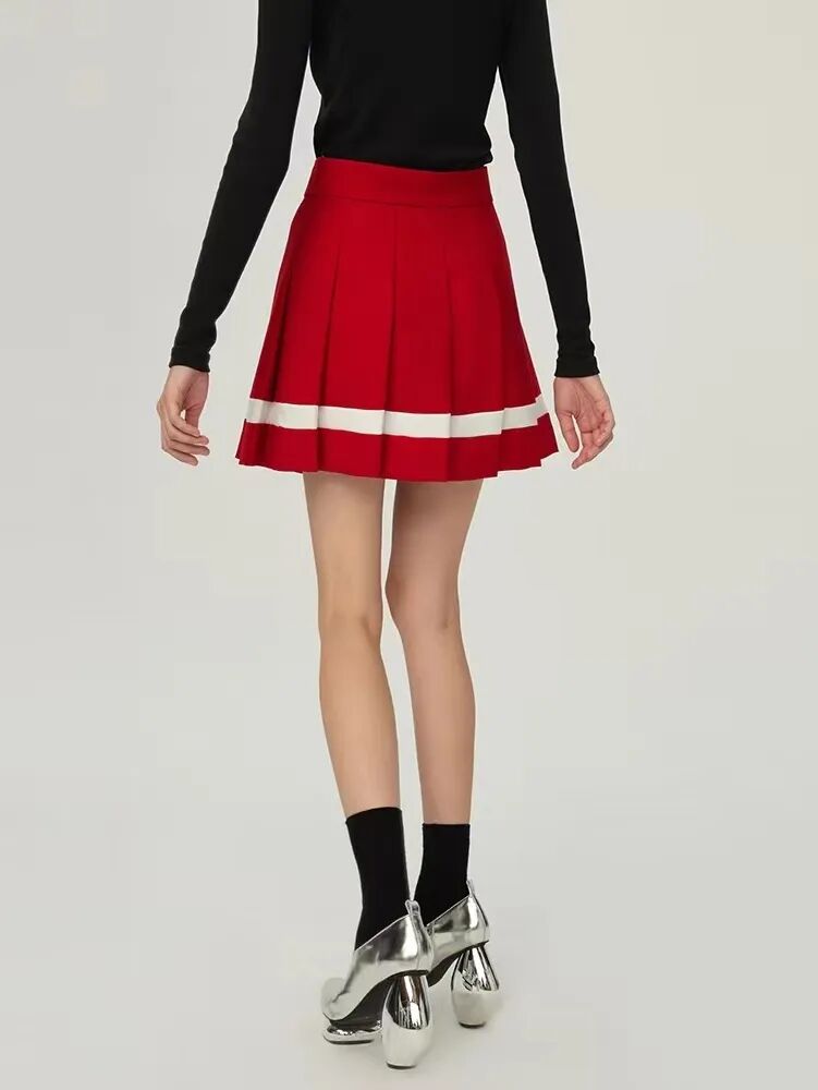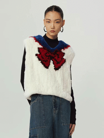 这款兔毛背心以独特的大蝴蝶结海军蓝领图案印花吸睛夺目,搭配红色百褶短裙,变身年味十足的美少女!