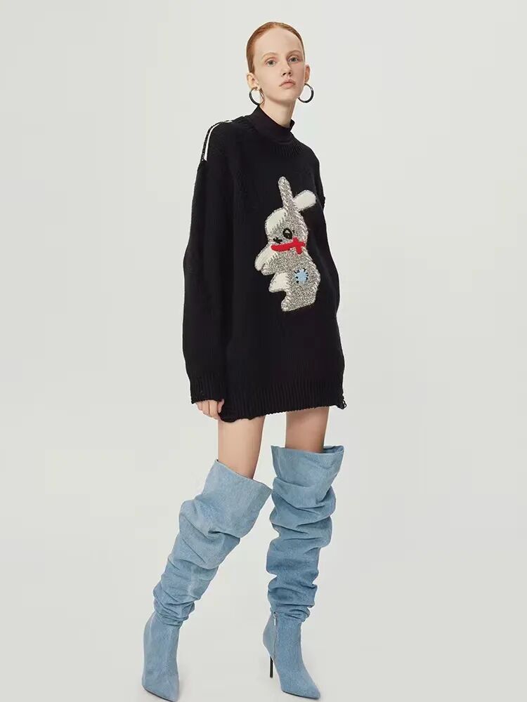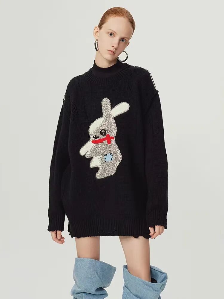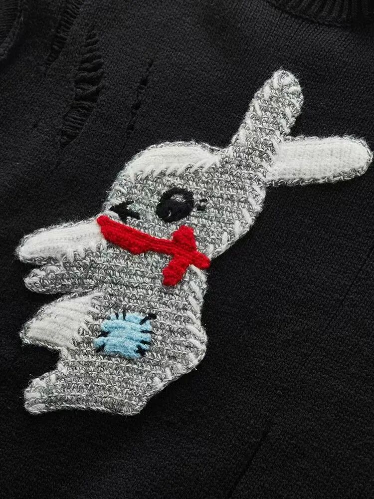 UOOYAA 手钩做旧补丁兔圆领毛衫